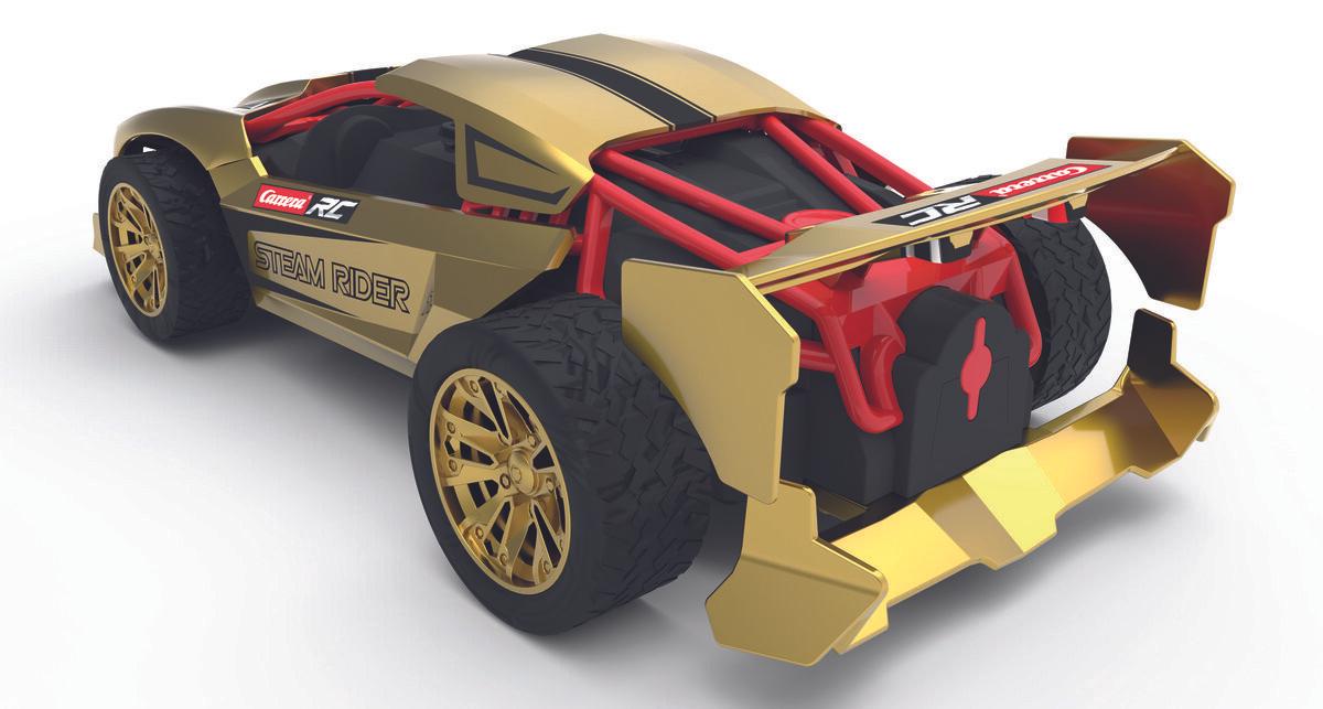 Carrera — известный производитель гусениц и автомобилей с дистанционным управлением, особенно в области слот-электромобили «Царь». Компания специализируется на производстве комплектов для автомобильных гонок на специальных трассах, оснащенных слотами, позволяющими дистанционно управлять небольшими моделями автомобилей. Steam Rider — транспортное средство с уникальной формой кузова, имеет эргономичный контроллер с технологией 2,4 ГГц и полным полнофункциональным управлением. Корпус в масштабе 1:16 изготовлен из прочного пластика. Пневматические шины, функция автоматического отключения и светодиодные фонари. Для игр в помещении и на улице. Автомобиль во время вождения после нажатия соответствующей кнопки на контроллере. может генерировать водяной пар для создания эффекта дыма - так называемый «горящая резина» – необходимо заполнить бак водой согласно инструкции производителя, содержащейся в руководстве пользователя. Готовый к поездке комплект включает в себя: USB-кабель для зарядки и сменный и эффективный аккумулятор 6. 4В 700 мАч LiFePO4 и батарейки для контроллера: 2 х ААА. Время зарядки: 90 мин. Время в пути ок. 20 мин. Максимальная скорость 15 км/ч. Длина автомобиля ок. 31,5 см. Бренд Carrera признан ведущим производителем гусениц и машин с дистанционным управлением (игровых машин). Carrera