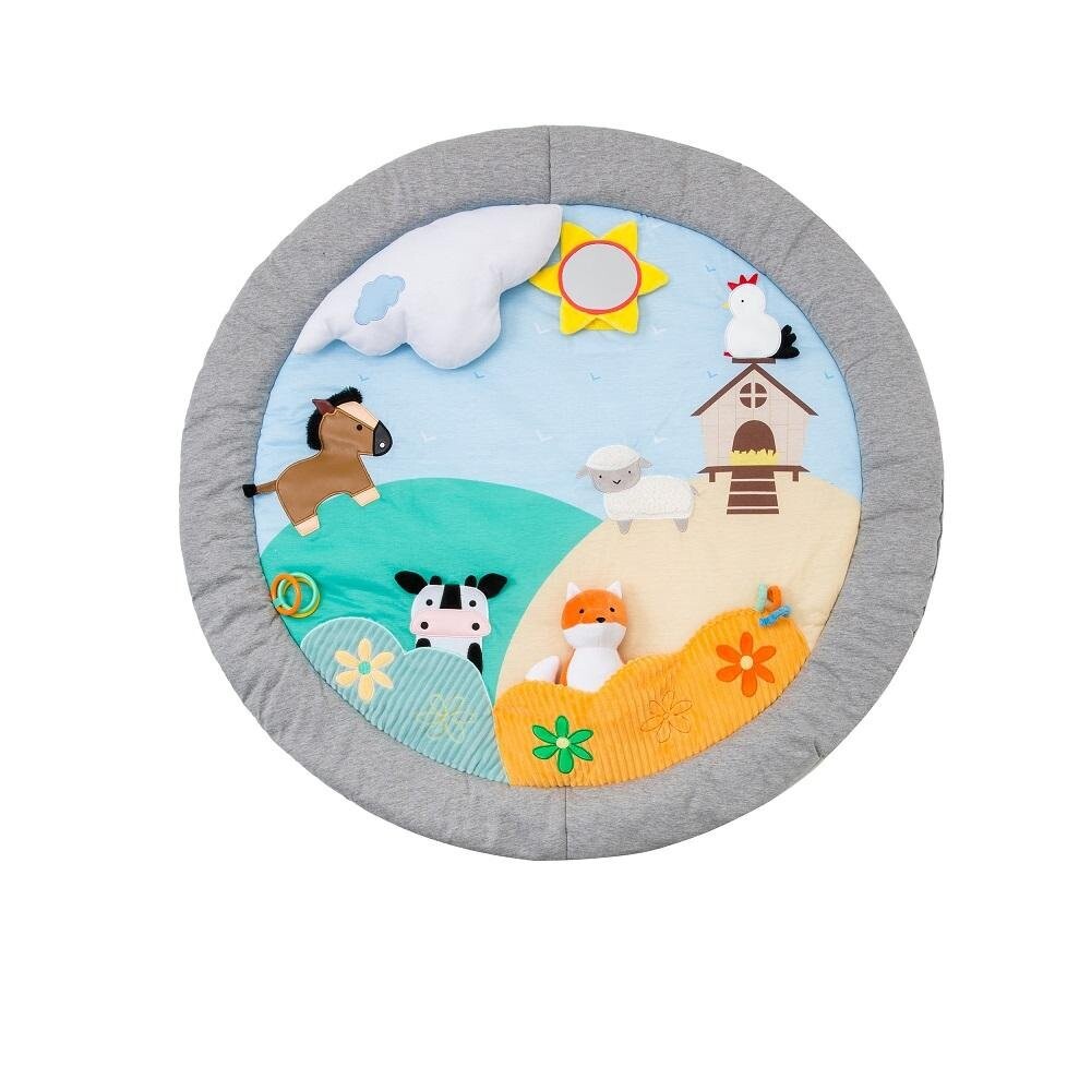 Развивающий коврик для детей с фермерским мотивом позволяет создать идеальное место для игр, которое стимулирует чувства вашего ребенка и помогает ему познавать мир. Он прекрасно стимулирует зрение и слух, а благодаря тактильным ощущениям поддерживает сенсорное развитие малыша и развивает зрительно-моторную координацию. Поверхность коврика содержит следующие элементы, которые благодаря разнообразию цветов и форм привлекают внимание ребенка: - зеркало в форме солнышка - курочка с пищалкой в крыле - два прорезывателя - корова с шуршащими ушами - съемная подушечка на липучке. Коврик идеально сочетается с тематически подходящей деревянной активирующей рамкой Little Big Friends. Изготовлен из современных, безопасных для детей материалов. Имеет удобную ручку на нижней стороне, благодаря которой его легко носить. Диаметр коврика: 100 см. Возраст: 0+.