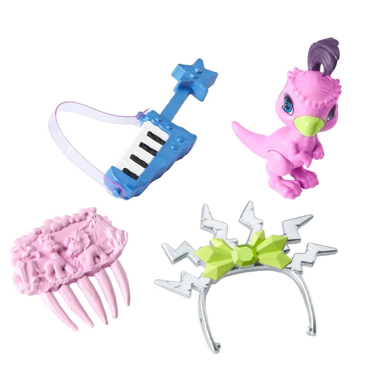 Входите в Cave Club — группу отважных молодых пещерных людей, опережающих свое время!У куклы Башли вьющиеся фиолетовые волосы с розовыми бликами и потрясающим металлизированным платьем с животным принтом.