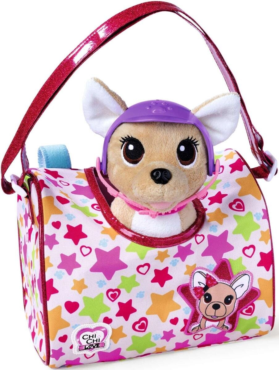Маленький чихуахуа ростом 20 см выполнен из мягкого плюша.Плюшевая собака в спортивном стилеChi Chi Love Grand Tour — очаровательная плюшевая собака в стиле чихуахуа, которая порадует детей своим спортивным стилем. В комплект также входит защитный шлем, который добавляет аутентичности веселью во время приключений с этим очаровательным талисманом. Детям понравится возможность нарядить Chi Chi Love в шлеме. готовя его к динамичным и насыщенным играм. Красочная сумка для транспортировки