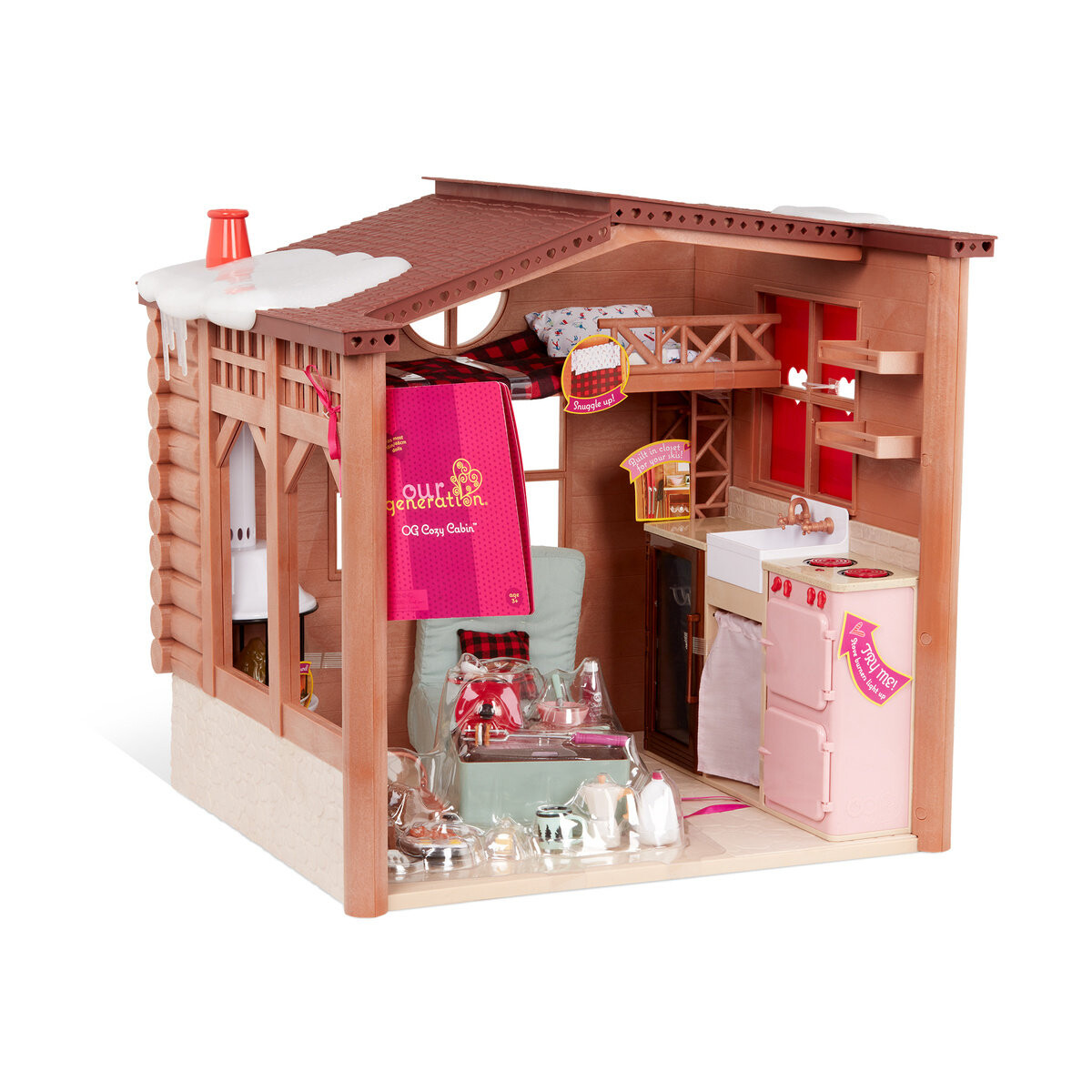ЗИМНИЙ ДОМ С ПОЛНОСТЬЮ ОБОРУДОВАНИЯ. Набор аксессуаров для кукол ростом 46 см из серии OurGeneration и кукол аналогичного размера. Имитация деревянного сруба на каменном фундаменте, очаровательного домика в горах. Покрыто льдом снаружи, обеспечивая уютное и теплое убежище внутри: - камин со звуками и светом - мягкое, удобное кресло с подушкой - стол - пуф с подносом - спальное место для куклы на антресоли - с постельное белье (подушка + одеяло) - кухонный уголок-кухня с плитой, холодильником и раковиной - шкаф с полкой и местом для бутылок - место для хранения лыж (лыжи и палки в комплект не входят) - полки - тарелка, миска, столовые приборы - кружка - кофейник - сковорода с крышкой, яичницей и беконом - английский завтрак перед катанием на лыжах - обязательно! - лопаточка - масленка с маслом - бутылка молока - бутылка сока - кастрюля с крышкой, наполненная питательной пищей. разогрев супа - половник - дрова в корзине - печенье с сахарной пастилой на длинной вилке для гриля у камина Дополнительно ставни на кухонном окне. Крыша покрыта замерзшим снегом, а свисающие сосульки свидетельствуют о трескучем морозе – поистине зимняя атмосфера и чудесный контраст с теплым интерьером дома! Встроенные 3 батарейки ААА. В комплект не входят куклы и собаки, представленные на фотографиях. Игрушка соответствует европейским, канадским и американским стандартам безопасности игрушек. Предназначен для детей от 3 лет и старше. Цвета и детали могут отличаться от представленных на фотографиях. Игрушка комплектуется производителем только товарной биркой, без специальной упаковки. Размеры дома: ширина хорошо . 60 см х высота хорошо . 55 см x глубина 50, 2 см. Размеры коробки: 60 см x 57 см x 53 см. 5смВ серию OurGeneration входят разнообразные привлекательные куклы ростом 46см в интересных стилистических аранжировках и многочисленные комплекты одежды, в том числе связанные с тематикой путешествий. Чрезвычайно интересные наборы аксессуаров позволяют создавать сценки, благодаря которым девочки смогут создать свой, захватывающий мир с многочисленными уникальными аттракционами. [video width="1920" height="100" mp4="