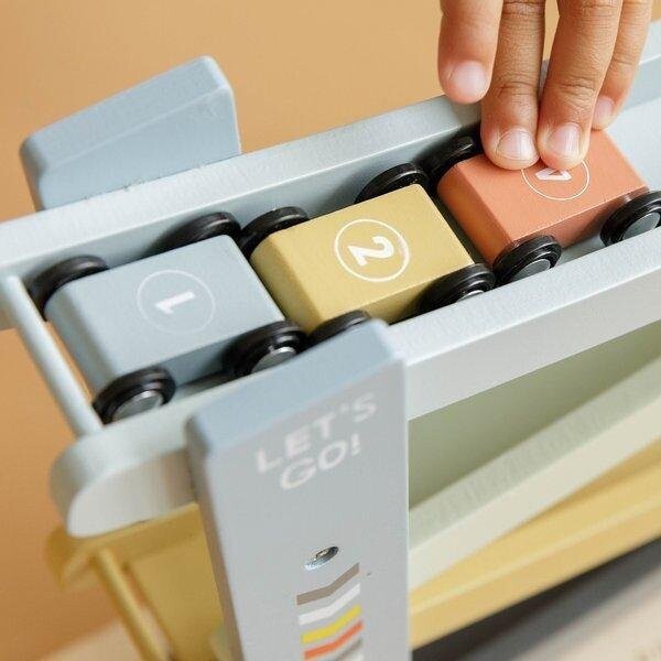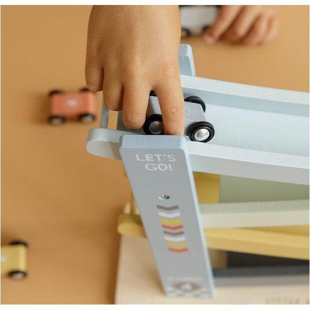 Деревянная горка для игрушечных машинок от Little Dutch. Горка имеет 4 уровня и 4 маленьких машинки. Игрушечные машинки запускались сверху вниз. В гоночные машины можно играть отдельно. Изготовлен из высококачественного дерева, окрашен безопасными красками на водной основе. Красиво упакован в картонную коробку, идеален в качестве подарка.
