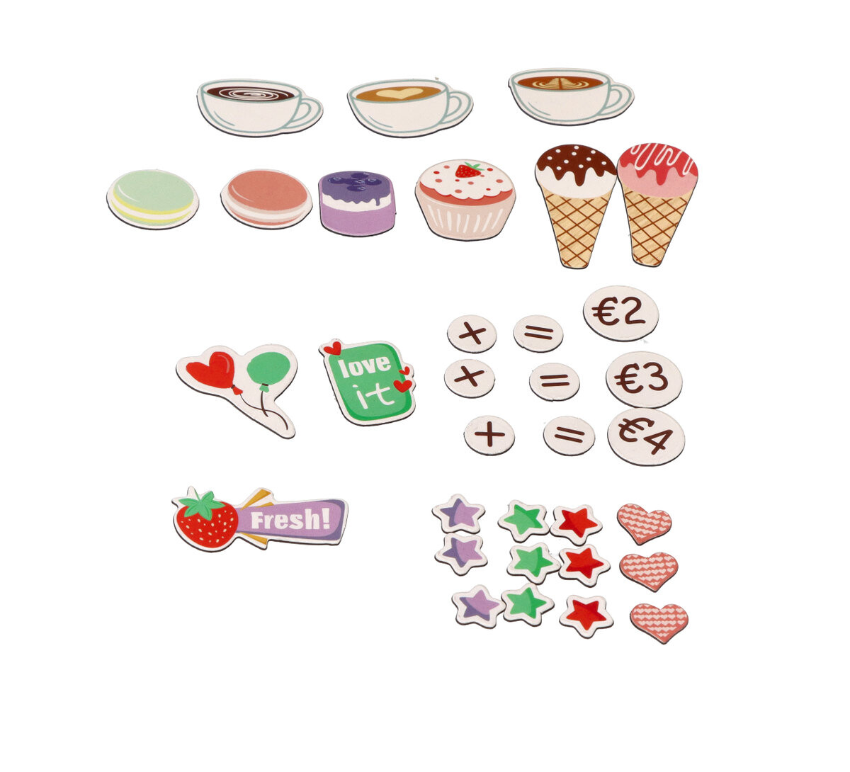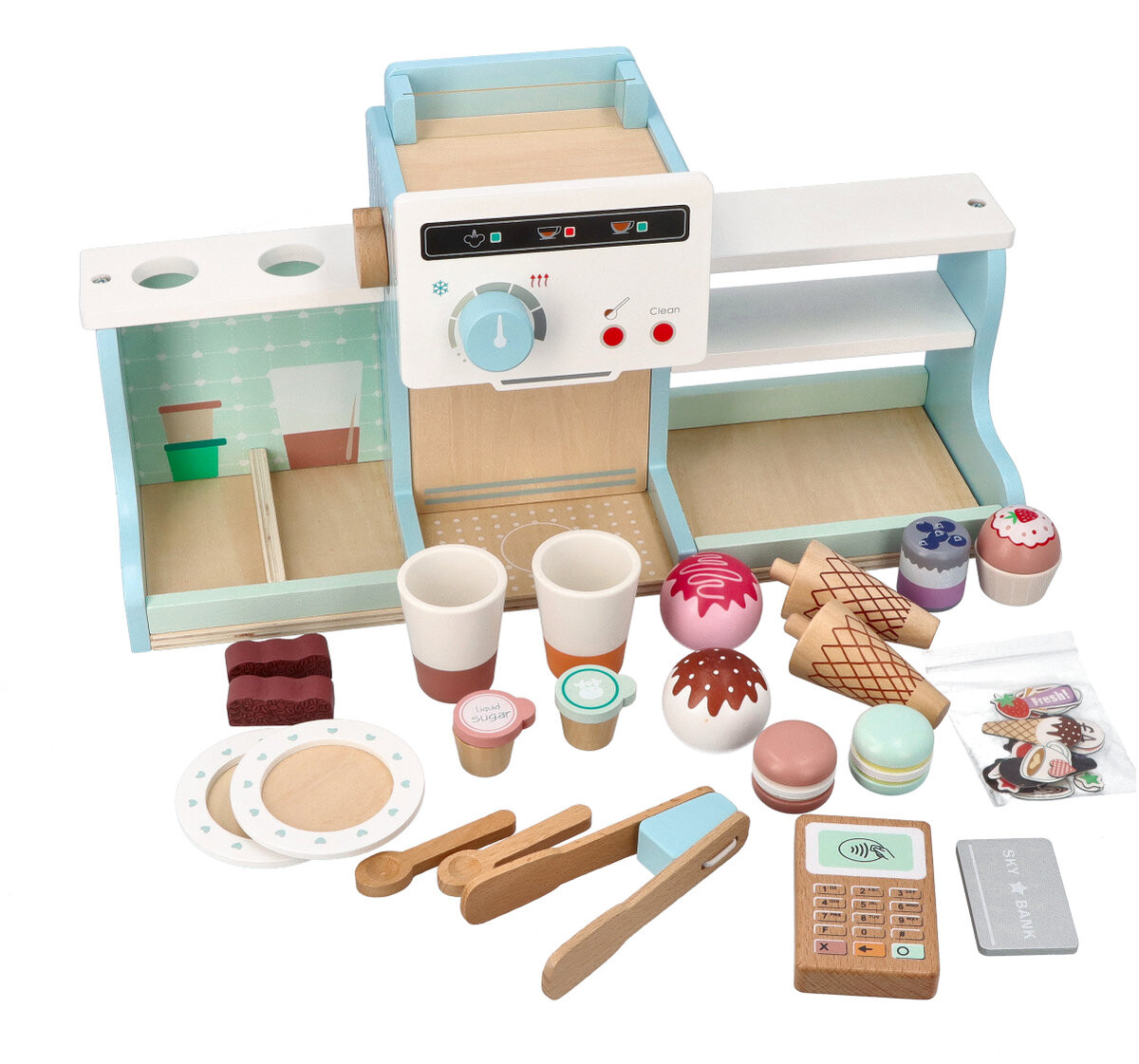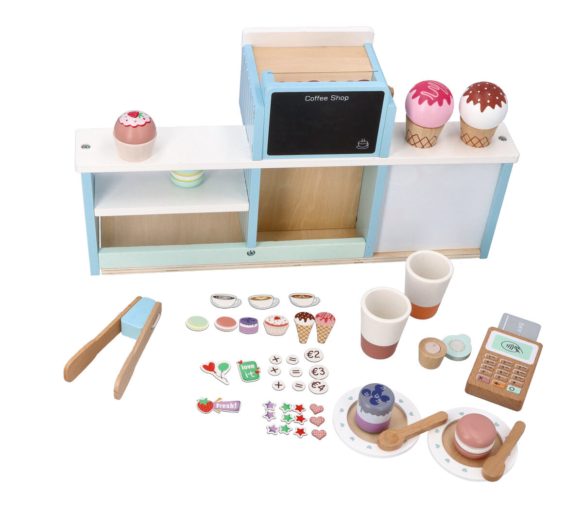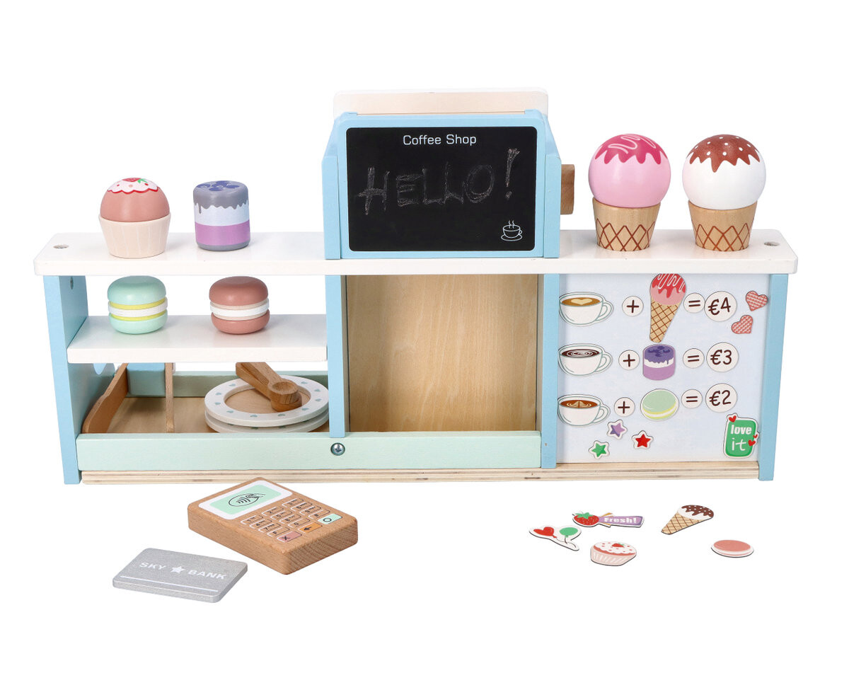*Двустороннее кафе для размещения, напр. на столе. С одной стороны находится задняя комната, где есть место для всех элементов и кофемашины с ручками. Другая сторона игрушки — кафе для клиентов со стойкой-витриной, небольшой доской для мела и магнитной доской.