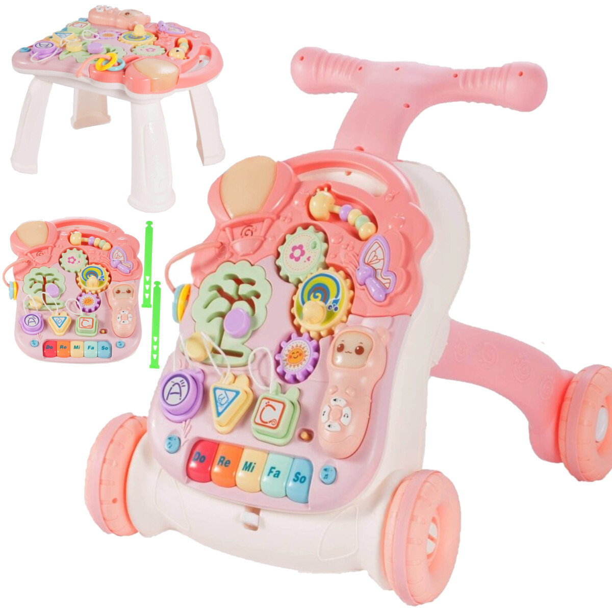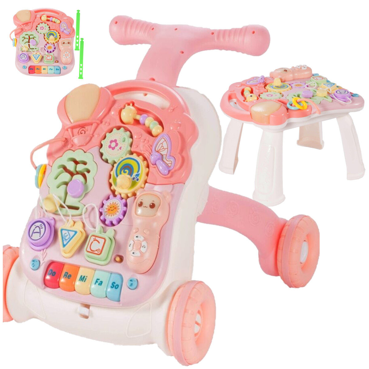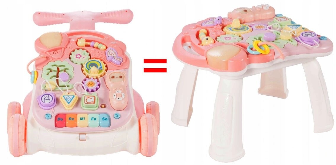 разноцветное пианино для игры сольмационной гаммы (do re mi fa so), которое помогает разучивать звуки красная кнопка меняет звуки, клавиши для мелодий три шестерни приводят друг друга в движение и одновременно воспроизводят мелодии красочные геометрические фигуры с буквами ABC на нитках дерево-лабиринт – перемещение и сопоставление бабочка при нажатии воспроизводит мелодии 3-уровневая панель регулировки громкости гусеница с тремя бусинками который может служить счетами для ребенка В НАБОР ВХОДЯТ:Интерактивные ходунки 5в1