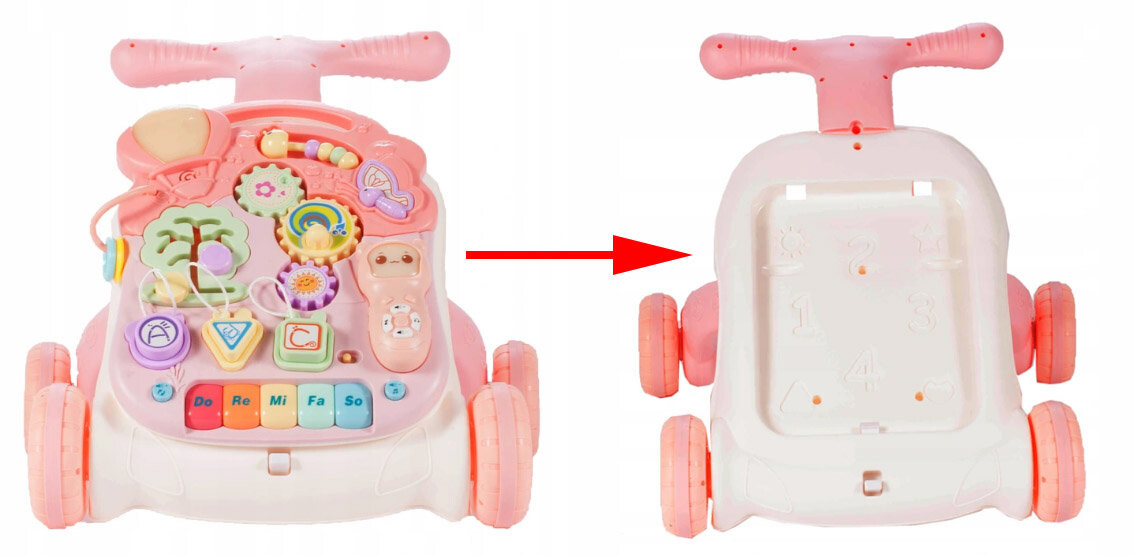 Благодаря толкателю вы сможете прекрасно совместить приятное с полезным, а ваш ребенок точно не заскучает благодаря множеству ярких аксессуаров. Сделать первые шаги – это настоящее испытание! Устойчивая спинка ходунков-толкателей поможет вашему малышу освоить нелегкий навык ходьбы. Обучающие ходунки – это не только идеальный спутник при первых шагах. Это также отличный игровой центр. Есть как постоянные элементы, так и элементы, которые можно снять и использовать для самостоятельной игры. ХАРАКТЕРИСТИКИ: