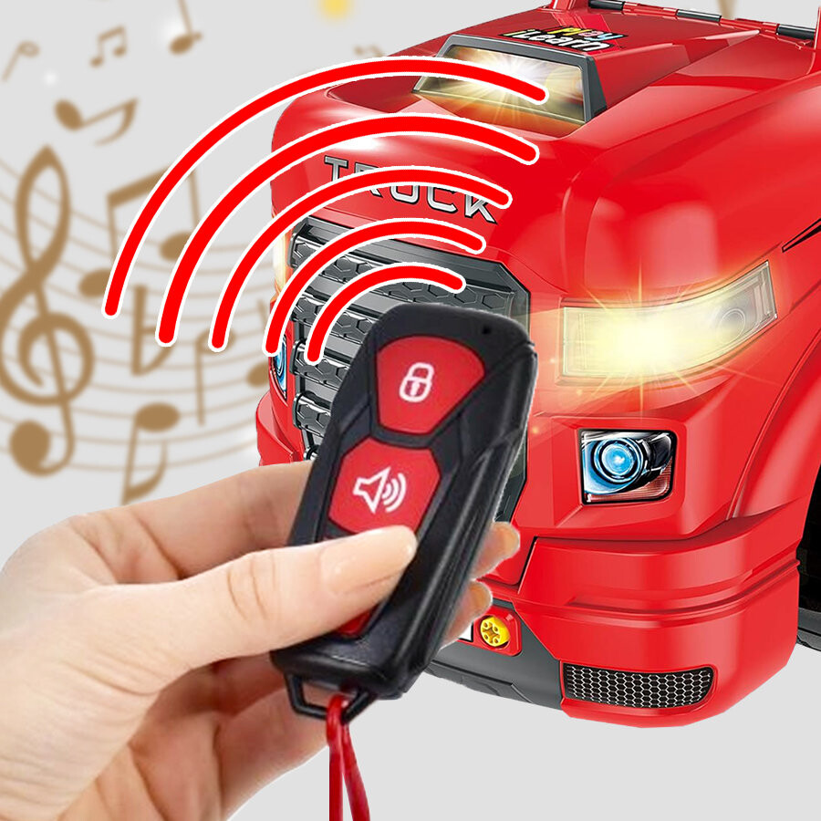 Игрушка дополнительно оснащена пультом дистанционного управления. который удаленно активирует отдельные функции грузовика: