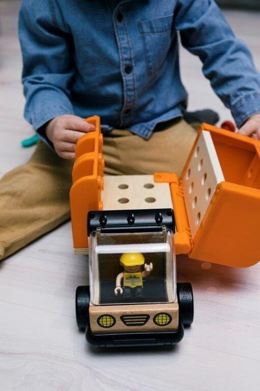 Загрузочная часть открывается, поворачивается вбок и образует инструментальную мастерскую. Он наполнен такими инструментами, как молоток, отвертка, гаечный ключ, гвозди, гайки и болты, доски с отверстиями, а деревянный элемент конструкции автомобиля и заранее просверленные в нем отверстия представляют собой движущуюся конструкцию и игровую площадку. Кабина грузовика открывается, и водитель-строитель в шлеме также полезен для игры.