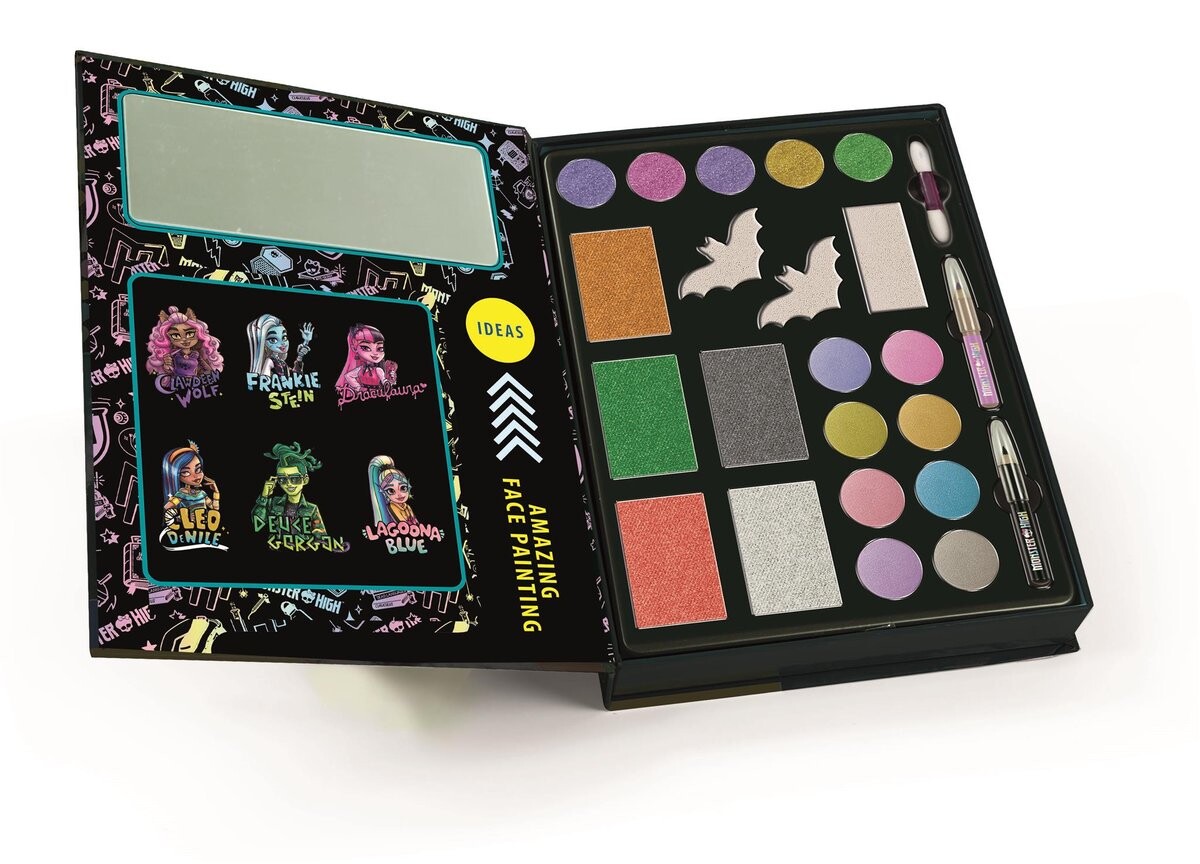 Содержит разноцветные тени для век, мелки и краски для лица, 3 спонжа в форме книги и 1 аппликатор для создания суперзабавных причесок!