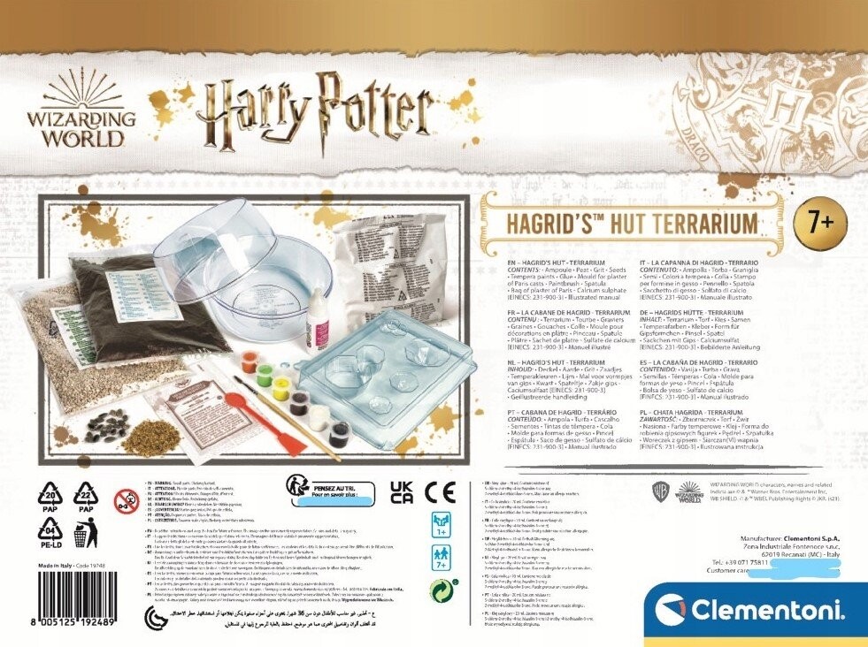 Террариум Clementoni Harry Potter 19248 стр.6 (19248 CLEMENTONI) • Фантастический набор для создания личной миниатюрной экосистемы с поистине волшебными пейзажами в идеальном стиле Гарри Поттера!• Игра, которая позволяет детям весело провести время, познавая важность ухода за растениями. • Включает в себя гипс, формы и темперные краски для создания фантастической хижины Хагрида с типичными тыквами. • Дети можно играть, используя семена, торф, почву, песок и камни, чтобы создать естественный ландшафт, полный растений вокруг Хогвартса. • Игрушку можно персонализировать и включить в нее элементы для украшения комнаты вашего ребенка.