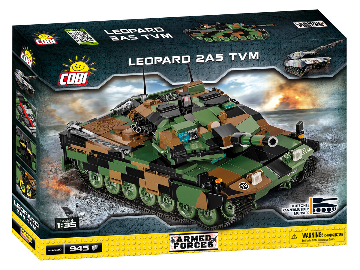 Модель танка Leopard 2A5 в версии ТВМ точно воспроизведена из 945 строительных блоков COBI и реалистично отражает внешний вид своего музейного аналога. Подвижные элементы, такие как башня и ствол танка, вращающиеся колеса и гусеницы, а также совершенно новые открывающиеся люки позволяют всем любителям военной техники насладиться моделью. Двигатель танка также открыт, что можно увидеть, открыв сервисный люк. Каждый взрослый любитель истории и доспехов наверняка будет рад добавить эту модель в свою коллекцию.