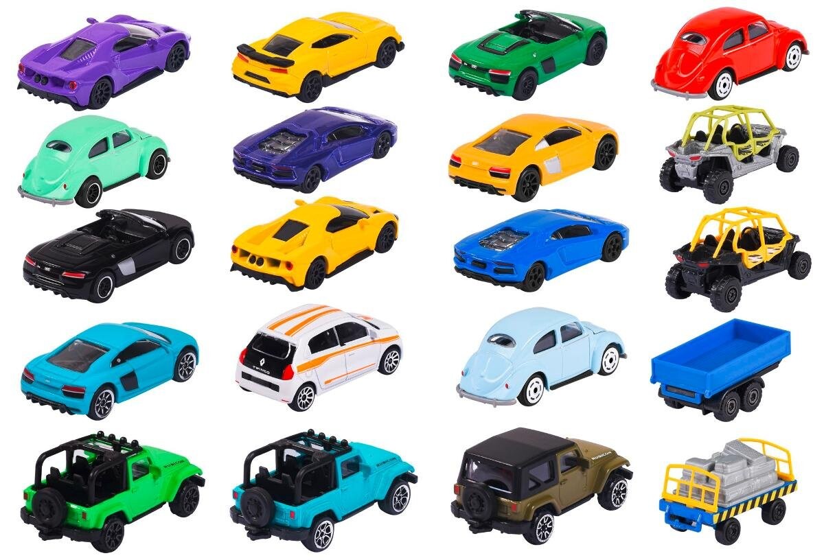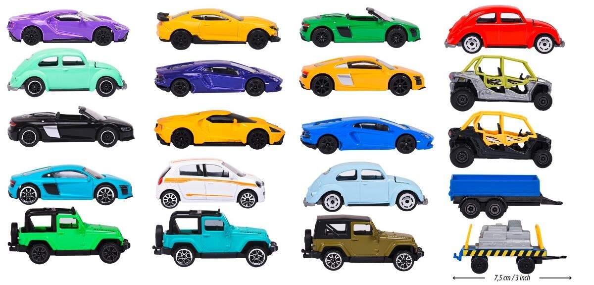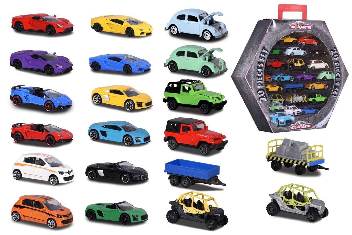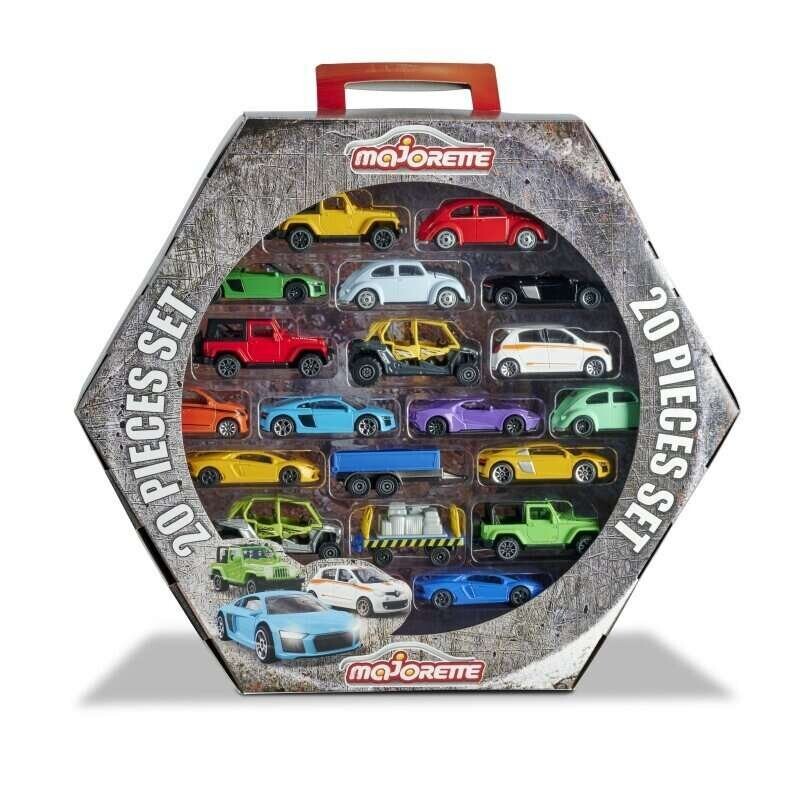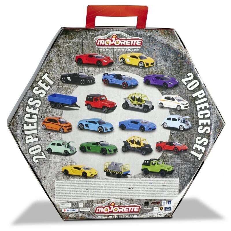 Содержит 20 различных моделей, отлитых под давлением, из серий Majorette Street Cars, Vintage и Explorer. Красиво оформленные автомобили включают в себя широкий спектр моделей автомобильного мира. Помимо классических моделей, также доступны гоночные автомобили, внедорожники, прицепы и багги. Некоторые автомобили имеют движущиеся части, которые можно открыть.