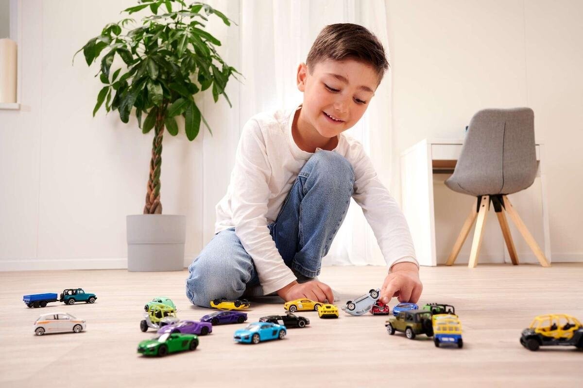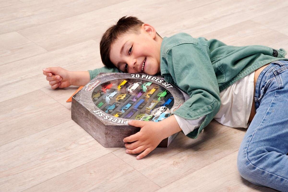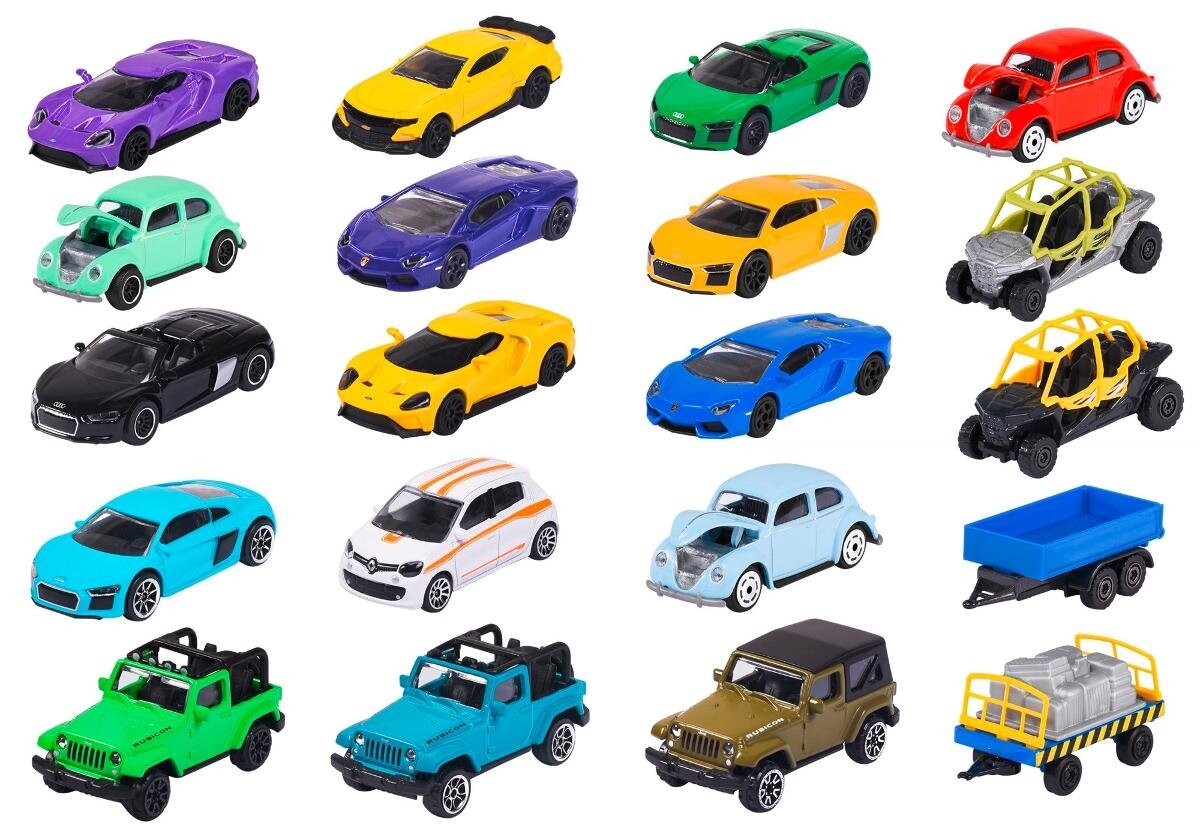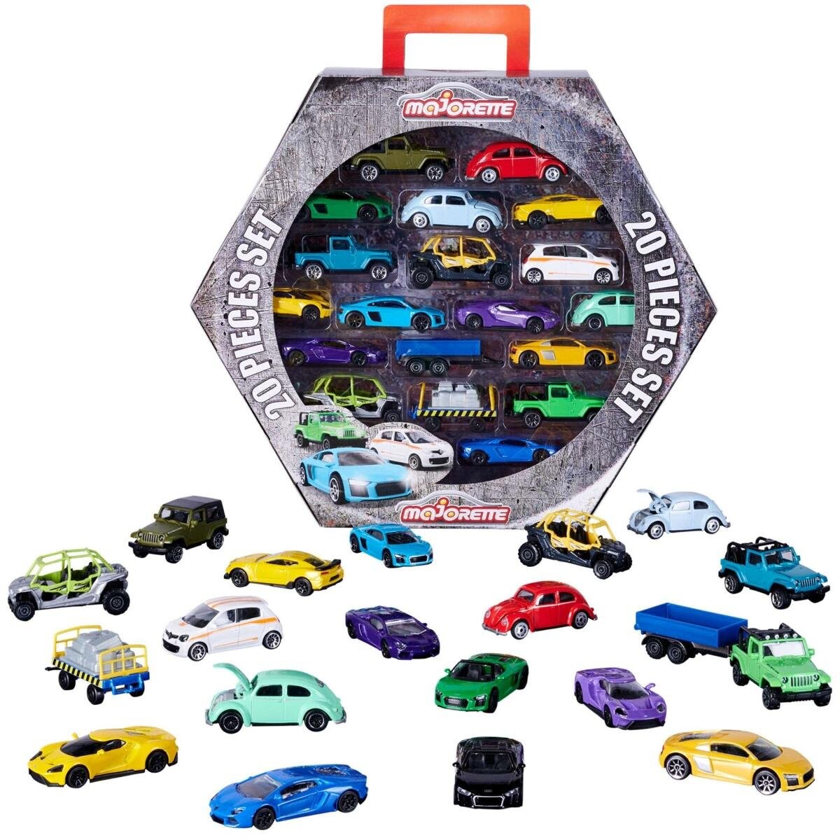 Содержит 20 различных моделей, отлитых под давлением, из серий Majorette Street Cars, Vintage и Explorer. Красиво оформленные автомобили включают в себя широкий спектр моделей автомобильного мира. Помимо классических моделей, также доступны гоночные автомобили, внедорожники, прицепы и багги. Некоторые автомобили имеют движущиеся части, которые можно открыть.