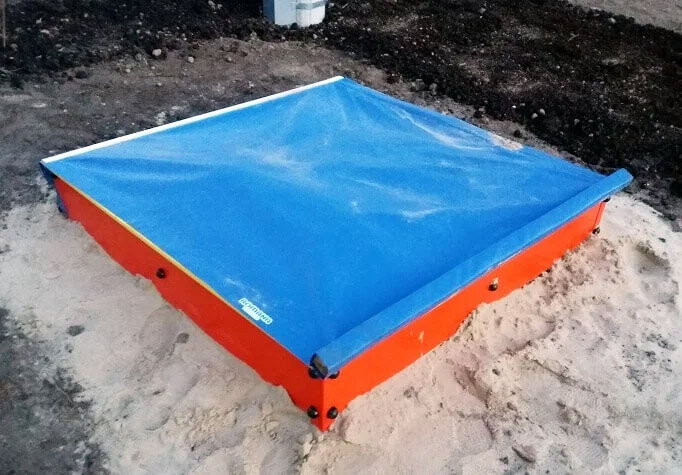 Брезент предназначен для защиты песочниц размерами не более 150 х 150 см. Его можно использовать круглый год во всех климатических зонах. Синий виниловый брезент следует прикрепить к одной из досок песочницы. Чтобы предотвратить случайное открытие песочницы, к противоположной стороне брезента крепят балку из хвойного дерева, что обеспечивает необходимую устойчивость конструкции.