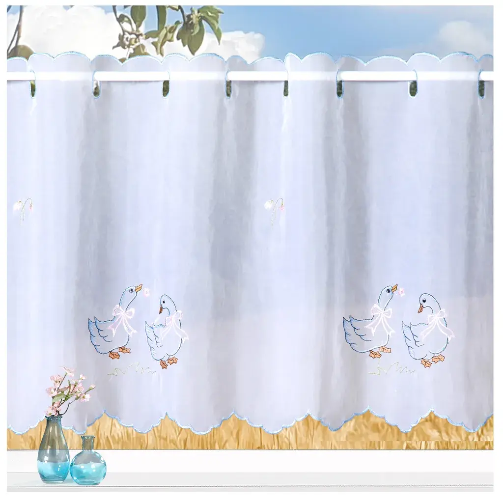 1 панельная штора с красивой вышивкой гусей и элегантно изогнутым кружевом по кайме и верхнему краю синего цвета