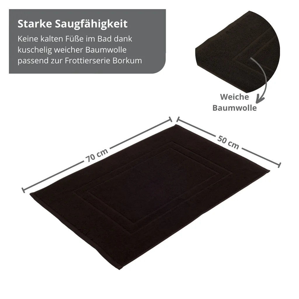 Коврик для ванной Borkum сочетает в себе визуальный и функциональный комфорт и обеспечивает комфорт в ванной комнате. Изготовленная из 100% хлопка, она отличается высоким качеством и плотностью 650 грамм на квадратный метр. Этот простой махровый коврик для ванной размером 50 x 70 см с подшитыми краями со всех четырех сторон доступен в белом или цветном исполнении и адаптируется к любому интерьеру. Ощутите успокаивающее тепло и уют, идеально подходящий для босых ног на холодной плитке.