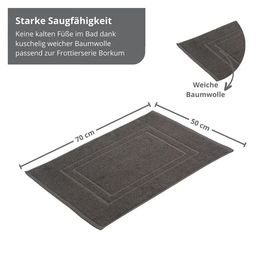 Коврик для ванной Borkum сочетает в себе визуальный и функциональный комфорт и обеспечивает комфорт в ванной комнате. Изготовленная из 100% хлопка, она отличается высоким качеством и плотностью 650 грамм на квадратный метр. Этот простой махровый коврик для ванной размером 50 x 70 см с подшитыми краями со всех четырех сторон доступен в белом или цветном исполнении и адаптируется к любому интерьеру. Ощутите успокаивающее тепло и уют, идеально подходящий для босых ног на холодной плитке.