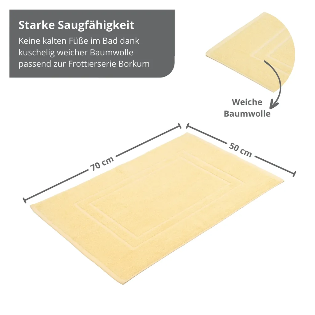 Коврик для ванной Borkum сочетает в себе визуальный и функциональный комфорт и обеспечивает комфорт в ванной комнате. Изготовленная из 100% хлопка, она отличается высоким качеством и плотностью 650 грамм на квадратный метр. Этот простой махровый коврик для ванной размером 50 x 70 см с подшитыми краями со всех четырех сторон доступен в белом или цветном исполнении и адаптируется к любому интерьеру. Ощутите успокаивающее тепло и уют, идеально подходящий для босых ног на холодной плитке.