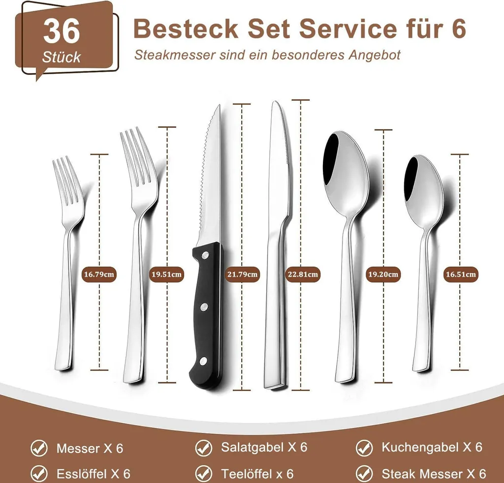 Набор столовых приборов из 36 предметов на 6 персонНабор столовых приборов из 36 предметов с 6 ножами для стейка Состоит из 6 ножей, 6 вилок, 6 ложек, 6 вилки для салата, 6 чайных ложек, 6 ножей для стейка. Этот серебряный набор столовых приборов удовлетворит все ваши обеденные потребности.