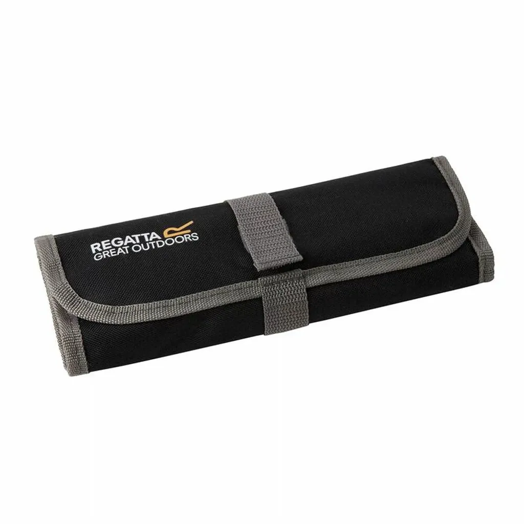 Походный набор «Регата» на 4 человека. Эта прочная регата столовых приборов состоит из четырех ножей, четырех вилок и четырех ложек. Столовые приборы изготовлены из нержавеющей стали с пластиковой ручкой, поэтому имеют длительный срок службы. Набор хранится в сворачивающейся крышке, поэтому столовые приборы можно легко взять с собой. Идеально подходит для кемпинга или в качестве дополнительного столового прибора для барбекю или вечеринки в саду! Характеристики: Цвет: черный/серебристый Пол: унисекс Материал: сталь/полиэстер В комплекте 4 ножа, 4 вилки, 4 ложки, 1 крышка подшипника.