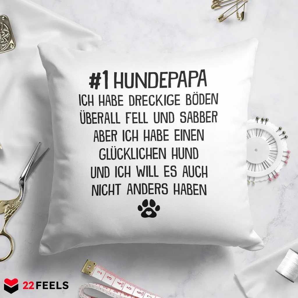 Высказывание на чехле для подушки: №1 Папа-собака: У меня грязные полы, шерсть и слюни повсюду, но у меня счастливая собака, и по-другому я бы не стал