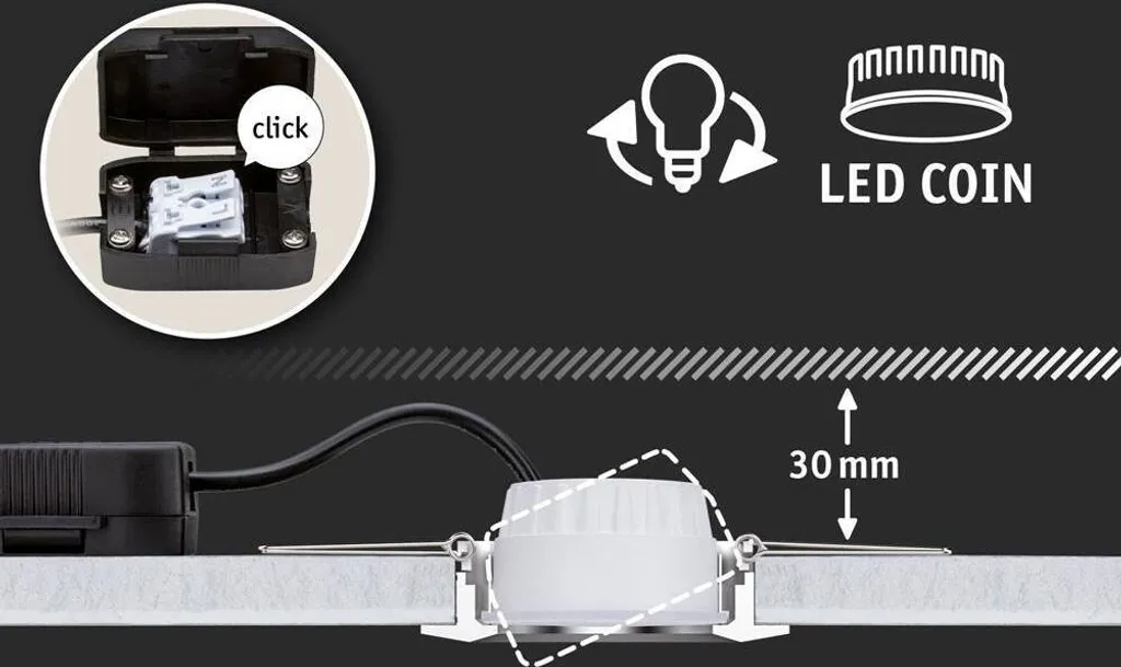 очень плоская - возможна установка также с небольшой глубиной полости от 30 до 35 мм для прямого подключения 230 В