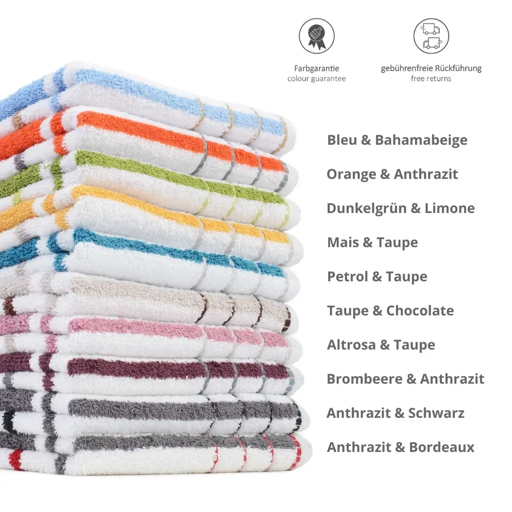 Махровая серия Potsdam – однотонная и в полоску – вас порадует! Эти роскошные полотенца впечатляют своими превосходными практичными свойствами и разнообразием ярких цветов. Благодаря 17 однотонным цветам и идеально сочетающимся сериям полос они открывают безграничные возможности комбинирования. Эти махровые полотенца идеально подходят для ванной комнаты, бассейна или сауны. Они расставят стильные акценты и подарят настоящие моменты благополучия. Получите идеальное сочетание качества и дизайна у себя дома.