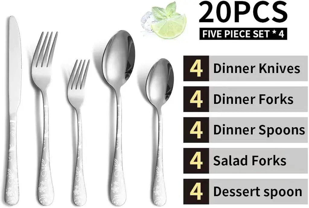Сервиз столовый на 4 персоны (20 предметов): 4 вилки, столовые ножи, ложки, вилки для торта, чайные ложки