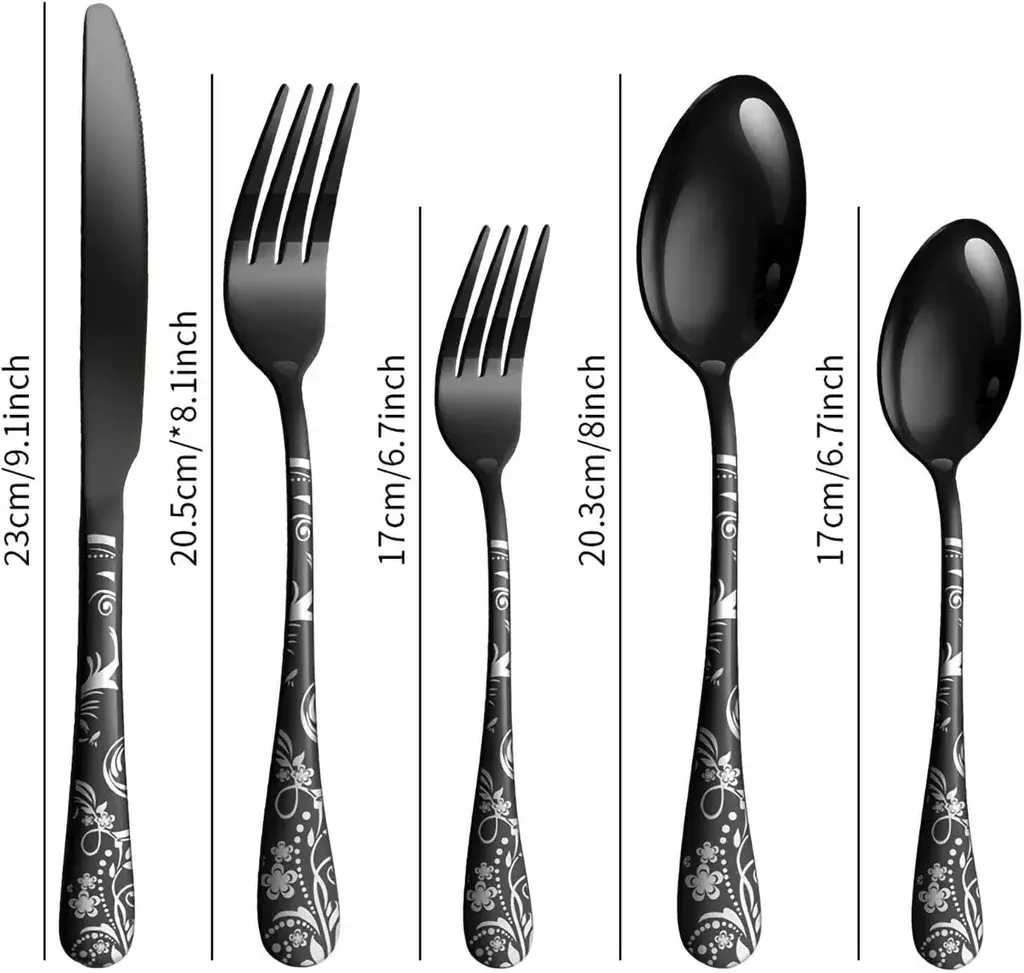 Удобная ручка: ручка столовых приборов удобна и проста в использовании. Конструкция ручки соответствует принципам эргономики и обеспечивает удобный захват, который не скользит. Это также облегчает очистку, поскольку на нем нет канавок и щелей. Стильная форма цветочного узора с лазерной печатью и отделкой придает вашему столу нотку элегантности и роскоши.