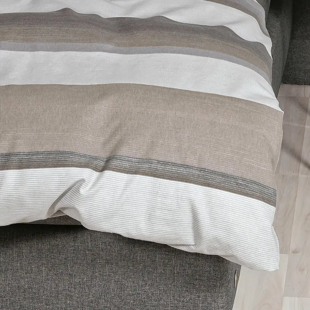 Комплект постельного белья Janine Design Beaver представлен в стильном современном дизайне с горизонтальными полосками в различных натуральных тонах, таких как бежевый, коричневый и кремовый. Это сочетание нежных, землистых цветов создает успокаивающую и гармоничную атмосферу в любой спальне.