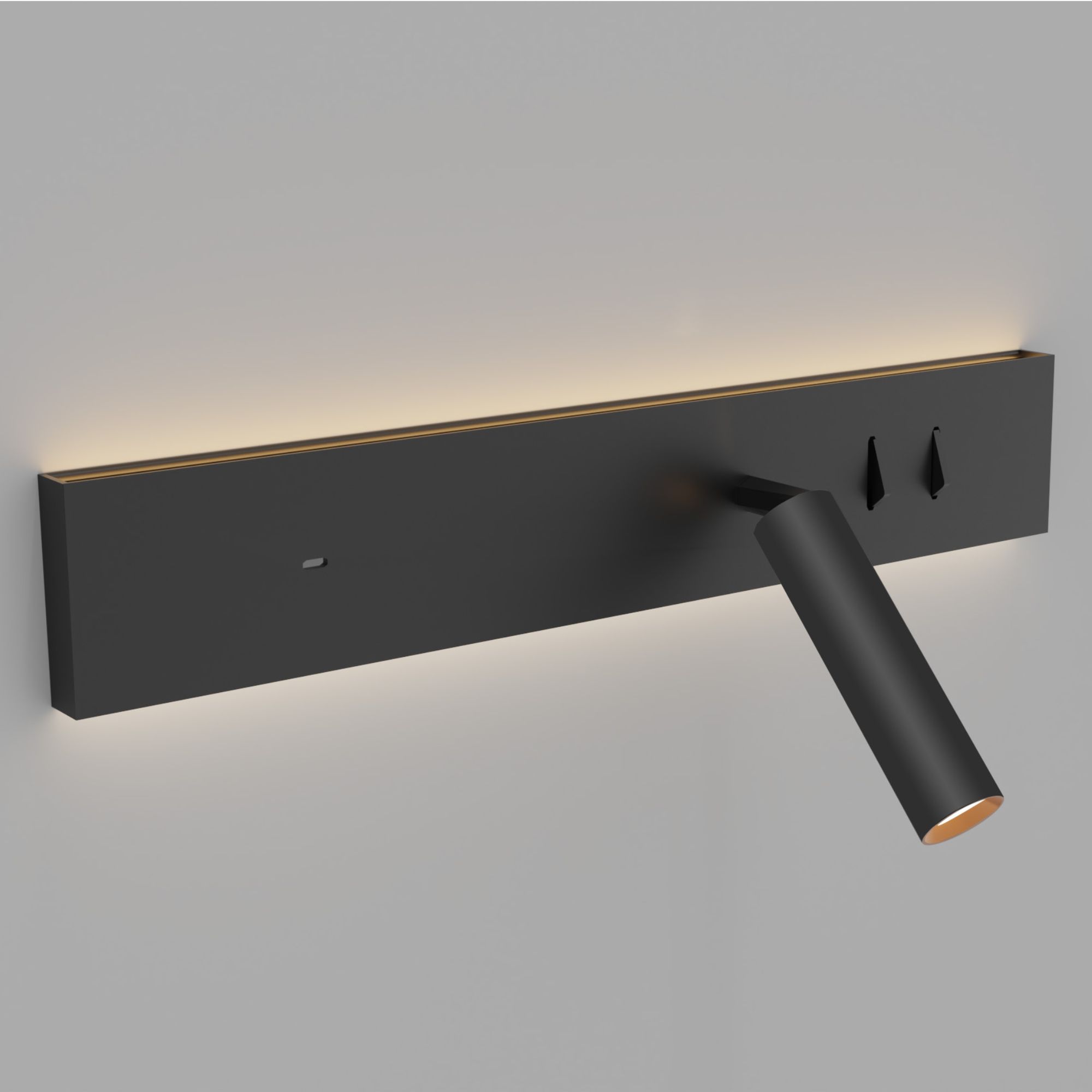 Панель-кровать с гибким точечным светильником для чтения, уютным окружающим освещением и мощным концентратором USB-C - дизайн в черном цвете с медным акцентом.
