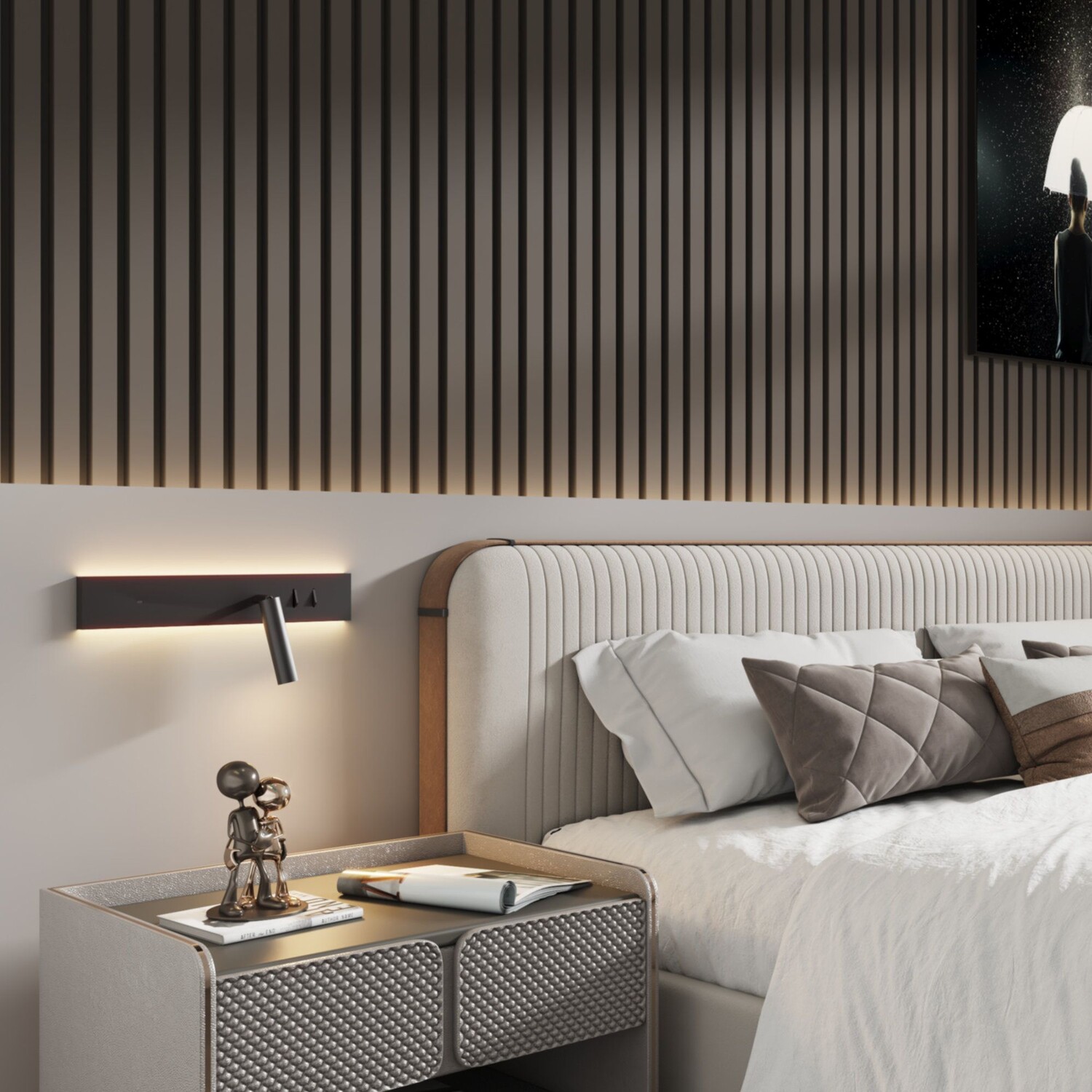 Панельный светильник для кровати kalb Avay с возможностью зарядки через USB-C сочетает в себе стильный дизайн и инновационную функциональность для оптимального чтения. Точка для чтения может быть отрегулирована в соответствии с вашими потребностями благодаря повороту на 180° и обеспечивает яркий, четкий свет для чтения с яркостью 4000 Кельвинов. Окружающий свет, освещающий верхний и нижний края панели, имеет приятную теплую цветовую температуру 3000 Кельвинов. Естественно, оба светильника можно включать и выключать по отдельности. Настенный прикроватный светильник отличается современным дизайном в черном цвете с элегантными медными акцентами и станет современным и функциональным дополнением вашей спальни. Разумеется, этот светильник доступен для левой и правой стороны кровати. (обратите внимание на выбор). Благодаря энергосберегающей светодиодной технологии светильник-панель для кровати является не только стильным, но и экологически безопасным. В нашем ассортименте вы найдете и другие инновационные светодиодные светильники для вашего дома.