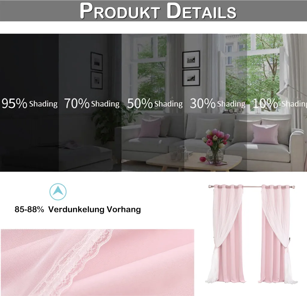 Шторы изготовлены из 100% полиэстера. Шторы изготовлены из высокоточной затемняющей ткани, которая эффективно блокирует рассеянный или нежелательный свет и снижает шум. Таким образом, вам не потребуются дополнительные плотные шторы.