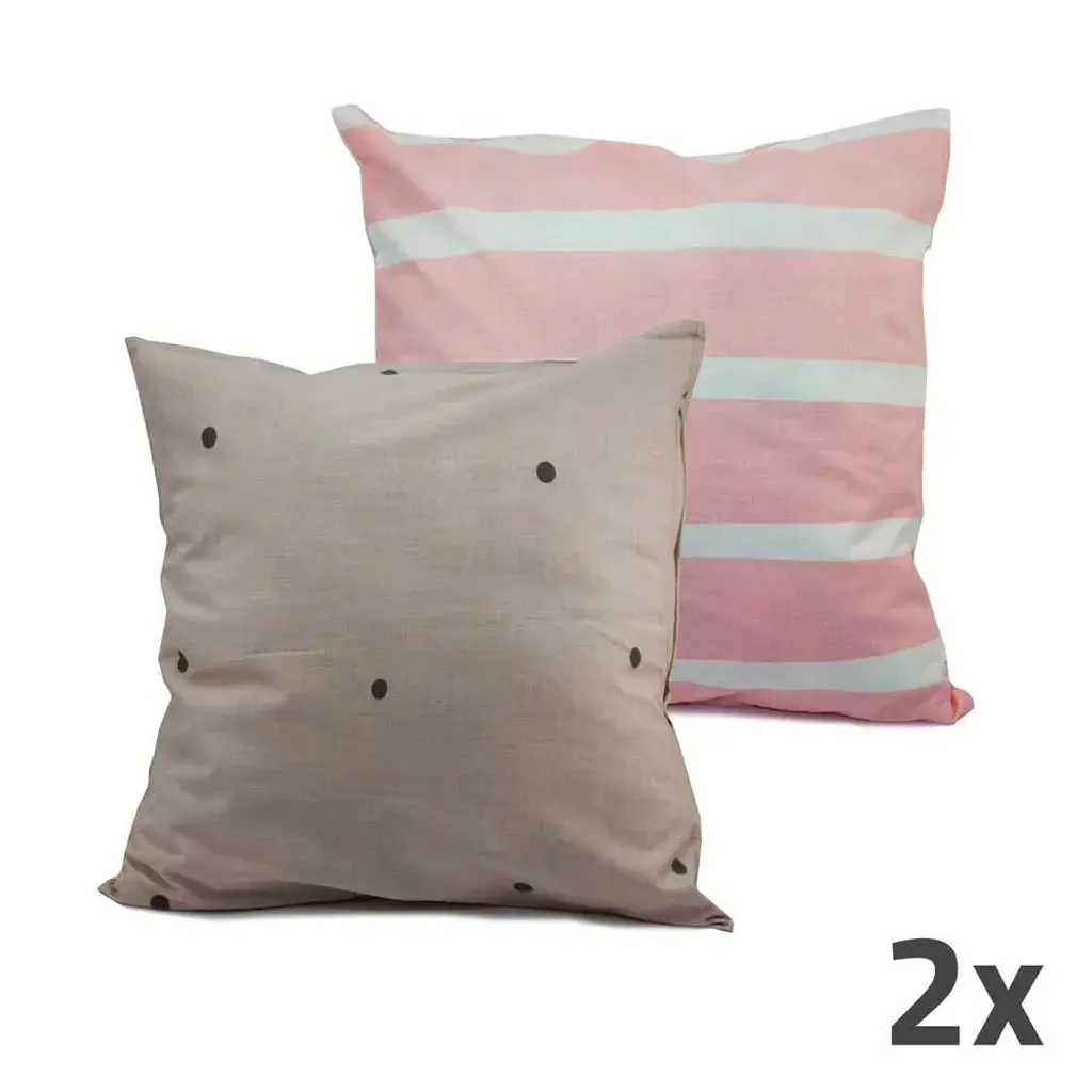 Двусторонний хлопковый чехол на подушку в интересном цветовом сочетании розовых и белых полосок и серого горошка — красивый аксессуар для дома. А также обеспечивает уют и тепло в вашем доме.