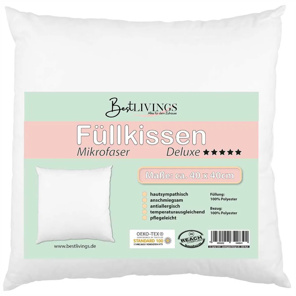 Дышащий наполнитель из 100% полиэстера. Бархатистый белый чехол изготовлен из 100% полиэстера и микрофибры. Вы также можете приобрести наволочки разных цветов и рисунков в магазине Bestlivings.