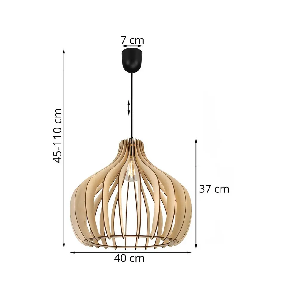 Размеры и качество изготовления-наша подвесная лампа имеет максимальную мощность 60 Вт, цоколь E27, 230 В. Высота лампы 110 см (регулируется в соответствии с вашим интерьером), ширина 40 см, высота рассеивателя 37 см и диаметр 40 см. Конструкция изготовлена из прочного, устойчивого к повреждениям металла, поэтому светильник прослужит вам долго.