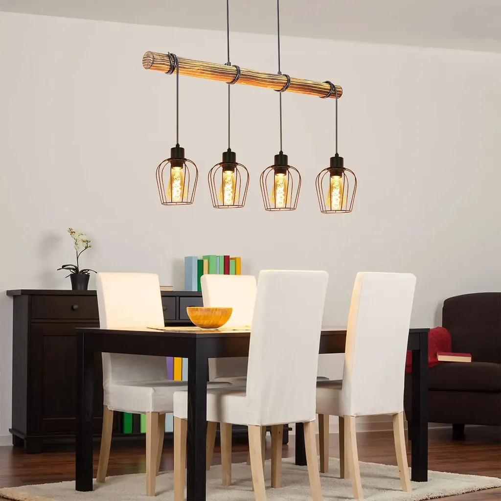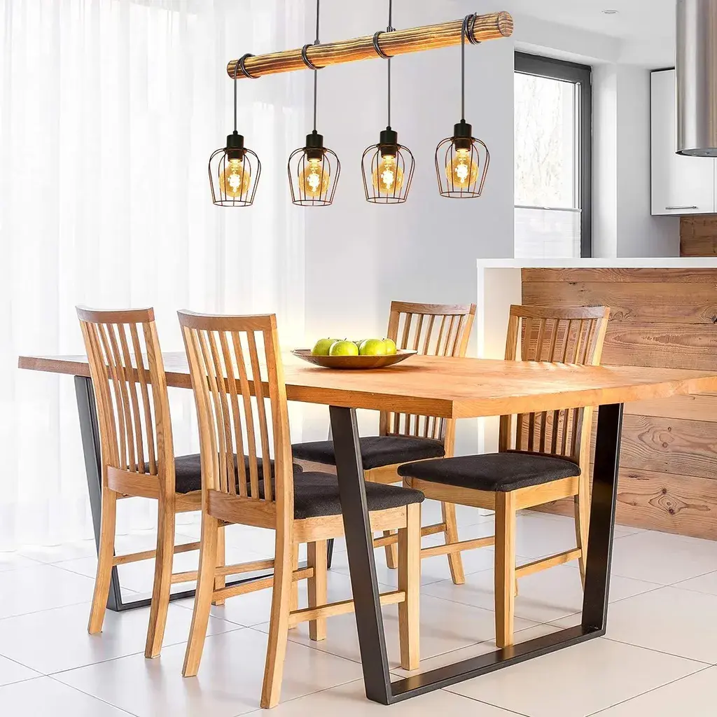 Ретро-индустриальный дизайн:Этот винтажный подвесной светильник с четырьмя старинными абажурами в виде клетки, в которых находится цоколь, прикреплен к деревенскому деревянному элементу, вокруг которого наматывается кабель. Он особенно впечатляет благодаря высококонтрастному цвету и концепции материала. В этой модели сочетаются естественность и индустриальный шарм, создавая домашний аксессуар, обещающий комфорт и стиль.