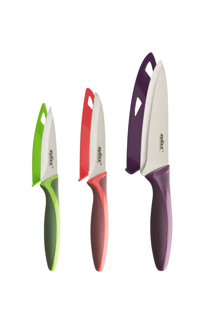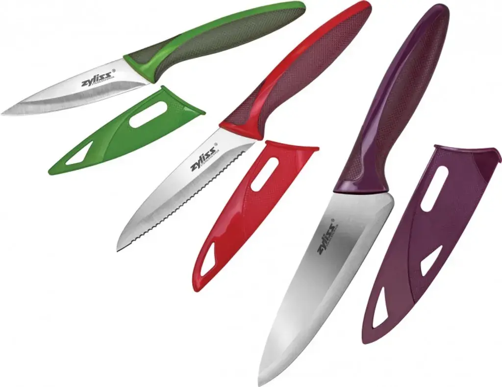 Набор ножей Zyliss из 3 предметов: идеально подходит для всех случаев. Набор ножей Zyliss из трех предметов изготовлен из японской нержавеющей стали. особенно прочный и долговечный. Благодаря разной длине лезвия кухонного ножа 9 см, кухонного ножа с зубцами 10 см и универсального ножа 14 см, с этим набором вы будете хорошо подготовлены ко всем непредвиденным обстоятельствам. Благодаря эргономичной ручке разноцветными ножами можно пользоваться особенно точно. Подходящие чехлы для ножей позволяют безопасно хранить набор весом 1,2 кг в кухонном ящике. Приобретите набор ножей Zyliss из трех предметов прямо сейчас!