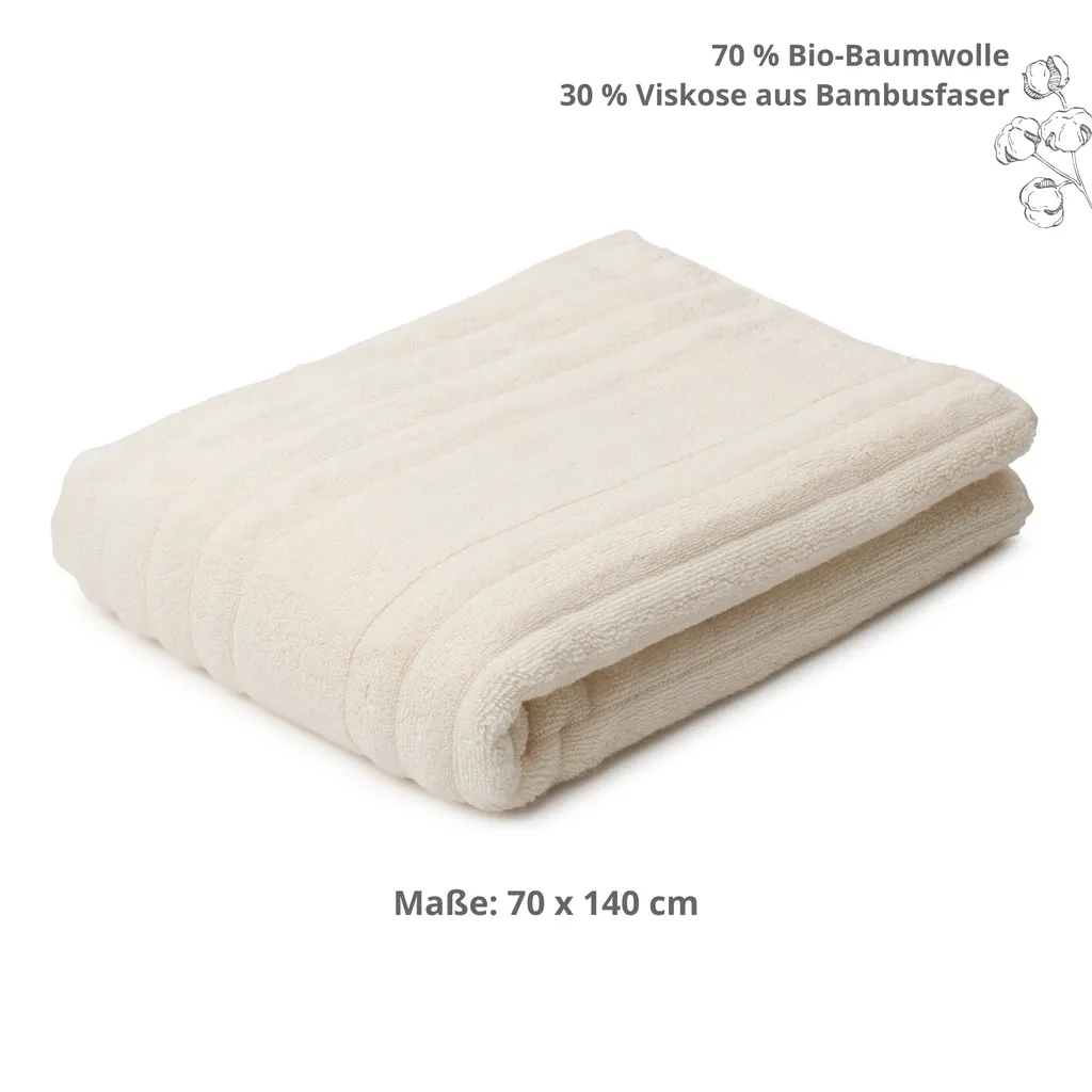 • Материал: Роскошнее быть не может. 70 % органический хлопок и 30 % вискоза, изготовленная из бамбукового волокна, плотностью 700 г/м², обеспечивающая нежнейшее ощущение на коже. Практичная петля для подвешивания на все стандартные держатели полотенец или крючки.