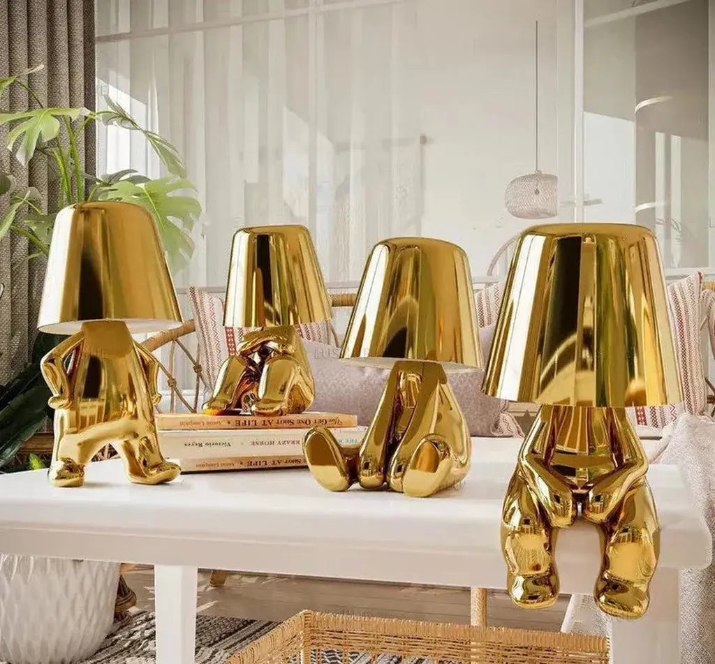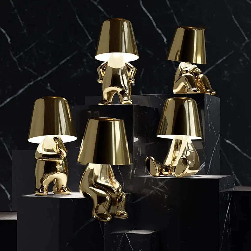 Дизайн Bins Brothers простой, но привлекательный и веселый. Это лампа в форме человека, доступная в золотом, серебряном и черном цветах. Человечек изготовлен из металла и имеет стилизованный дизайн. Голова самца действует как кнопка включения/выключения лампы, которая срабатывает при прикосновении. Когда вы прикасаетесь к голове самца, лампа включается или выключается, и мягкий, теплый свет меняет комнату. Светодиодная лампа в светильнике излучает теплый белый свет, создающий расслабляющую атмосферу.