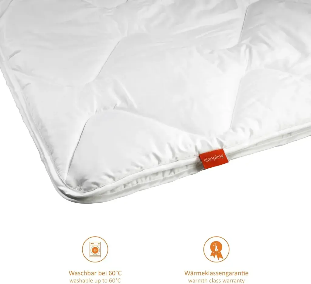 Наше одеяло из микрофибры Basic 100 — идеальный компаньон для сна круглый год. У вас есть возможность выбрать легкое летнее одеяло, теплое зимнее одеяло, всесезонное одеяло и четырехсезонное одеяло разных классов тепла. В дополнение к различной плотности наполнения одеяла 4-сезонное одеяло обеспечивает еще большую гибкость. В этом случае вы получите два одеяла. Легкое одеяло с меньшим количеством наполнителя, что делает его идеальным летним одеялом, и одеяло со средним уровнем наполнения, которое идеально подходит в качестве переходного одеяла на весну и осень. Оба одеяла одеяла «4 сезона» затем можно соединить друг с другом с помощью застежек-кнопок, создав уютное и теплое зимнее одеяло. Высококачественный стеганый чехол из микрофибры и наполнитель из 100% полиэстера обеспечивают приятный мягкий сон. Одеяло можно стирать при температуре до 60 градусов, поэтому оно идеально подходит для аллергиков. Затем просто положите его в сушилку, и ваше одеяло снова готово к использованию. Вся продукция семейств Sleepling Basic и Comfort производится известными производителями и, конечно же, соответствует современным стандартам ().