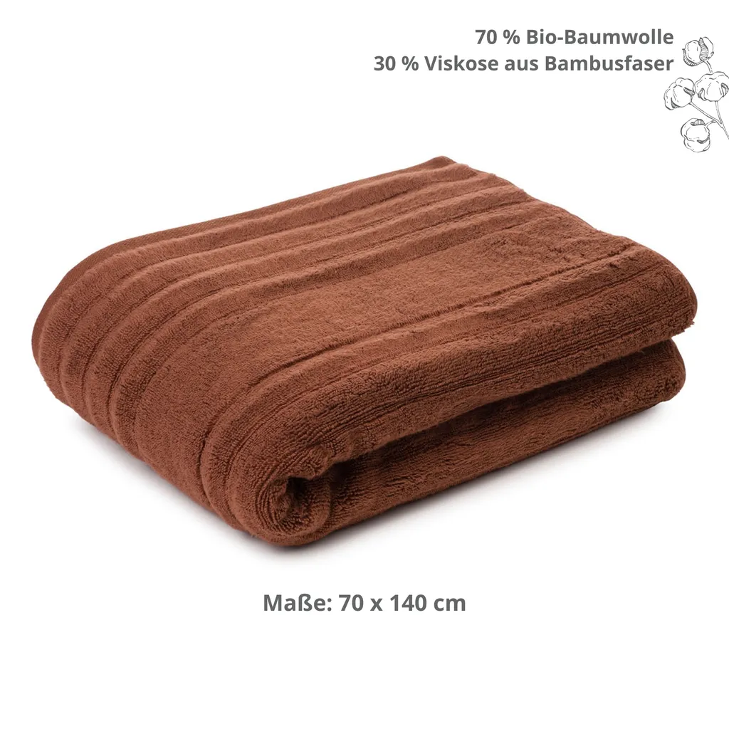 • Материал: Роскошнее быть не может. 70 % органический хлопок и 30 % вискоза, изготовленная из бамбукового волокна, плотностью 700 г/м², обеспечивающая нежнейшее ощущение на коже. Практичная петля для подвешивания на все стандартные держатели полотенец или крючки.
