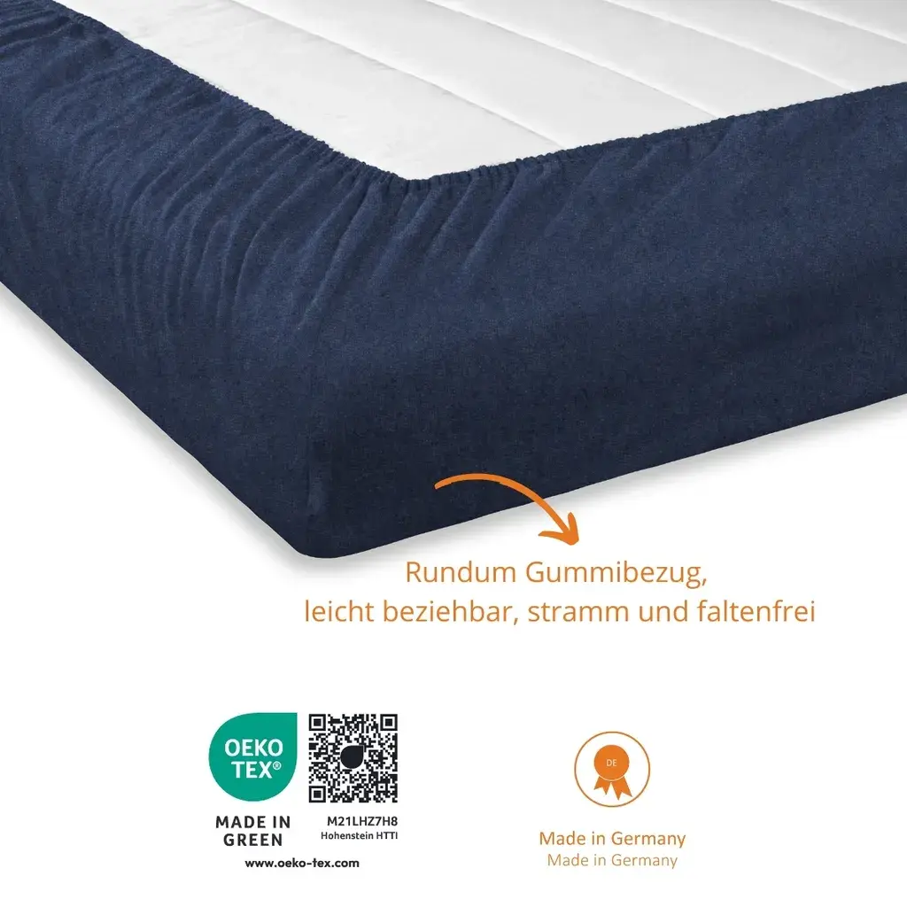 • Качество: Простыня имеет эластичную ленту по всему периметру для практичного и легкого надевания. Сравните это с продуктами конкурентов, которые часто имеют только угловые резинки или резинки на головном и нижнем концах. Благодаря эластичной ленте по всему периметру ткань плотно и не мнется на матрасе. Только качество Made in Germany. Для коротких маршрутов доставки и самых высоких требований к качеству и экологичности