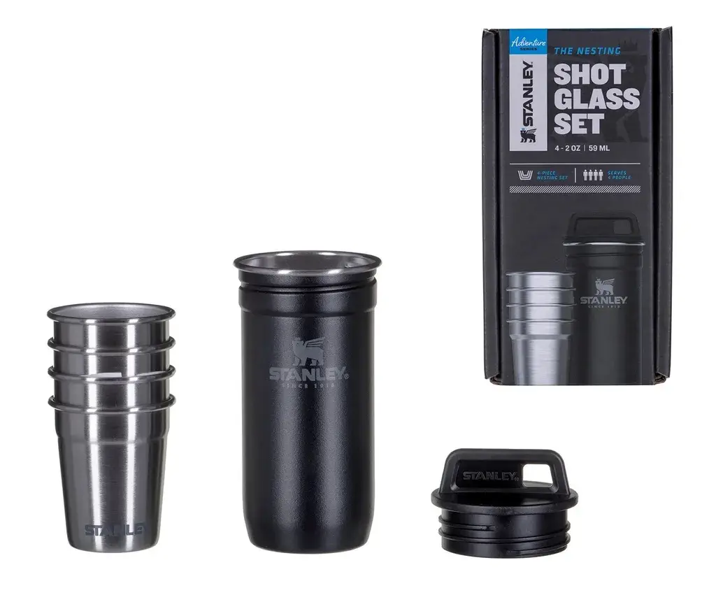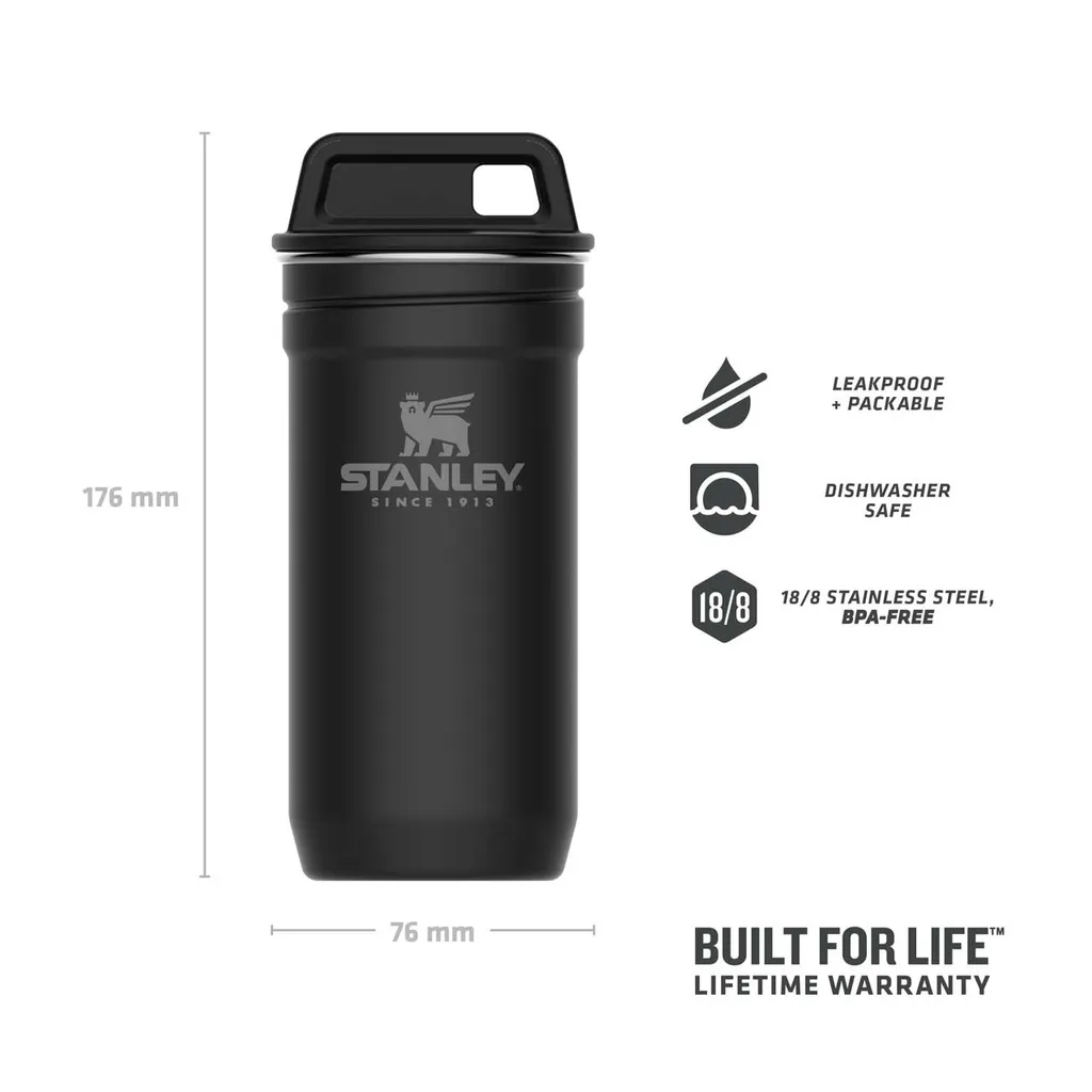 НАБОР СТАКАНОВ Stanley ADVENTURE состоит из 4 чашек (стаканов) из нержавеющей стали емкостью 60 мл каждая, изготовленных из нержавеющей стали 18/8, которые упакованы в привлекательный контейнер из нержавеющей стали матового черного цвета с завинчивающейся крышкой. Набор можно легко прикрепить к багажу благодаря петле для подвешивания, а все детали можно мыть в посудомоечной машине.