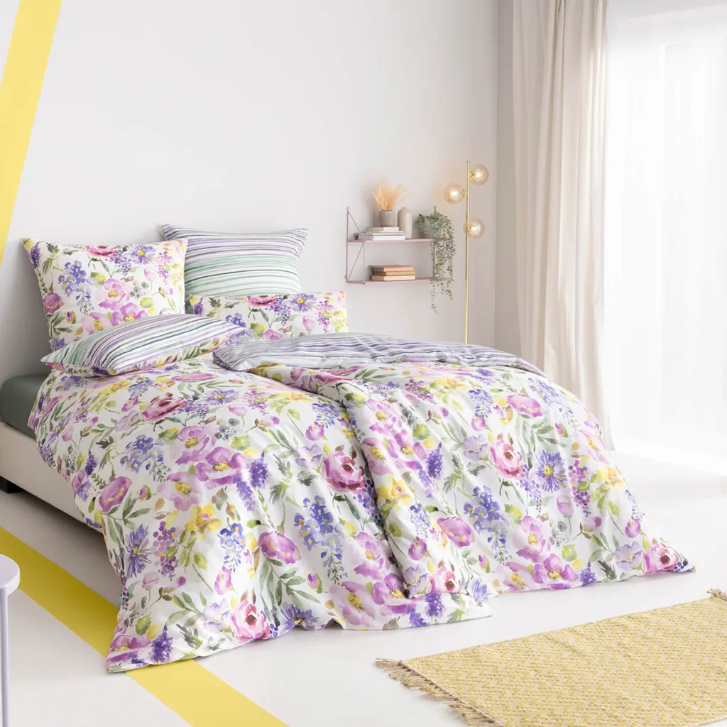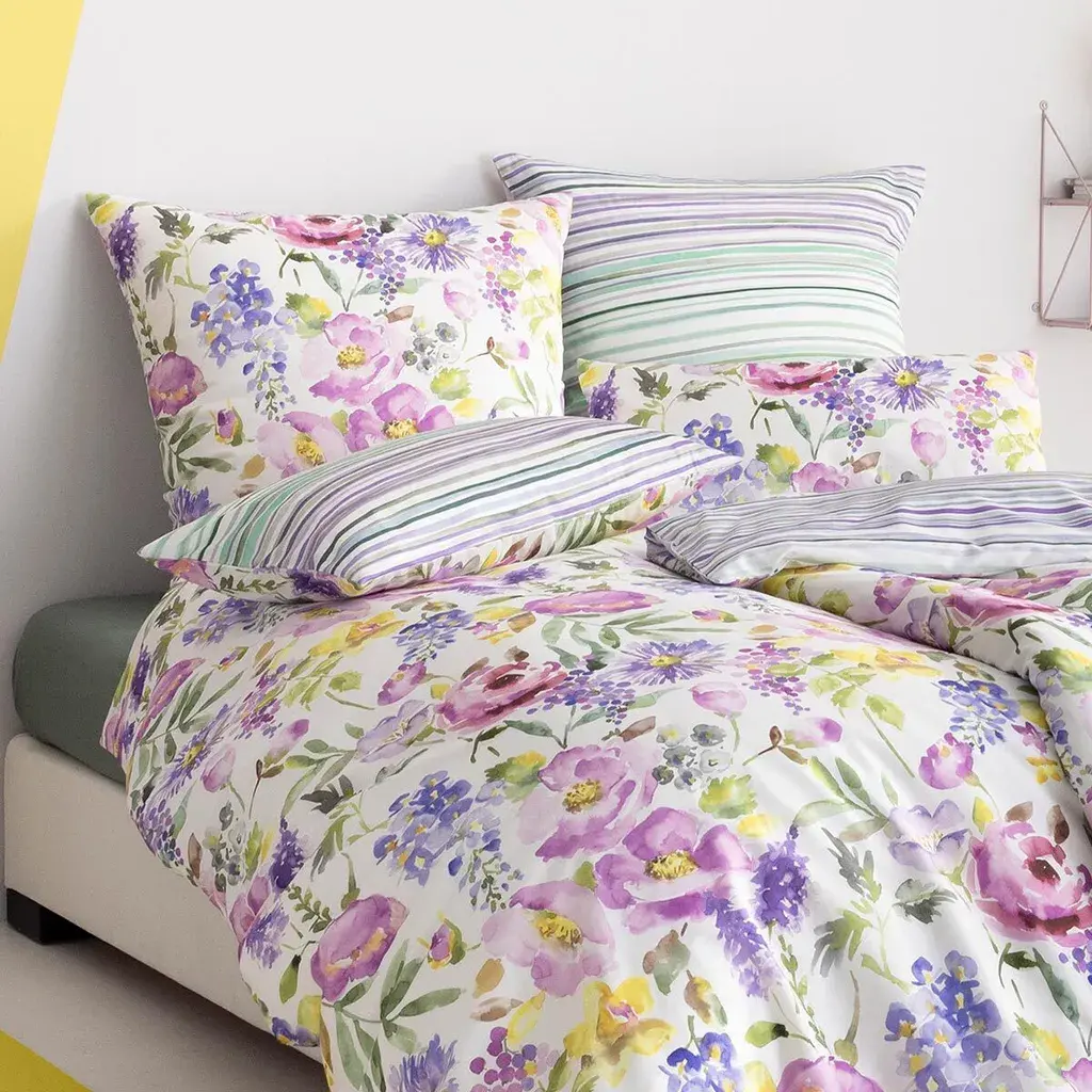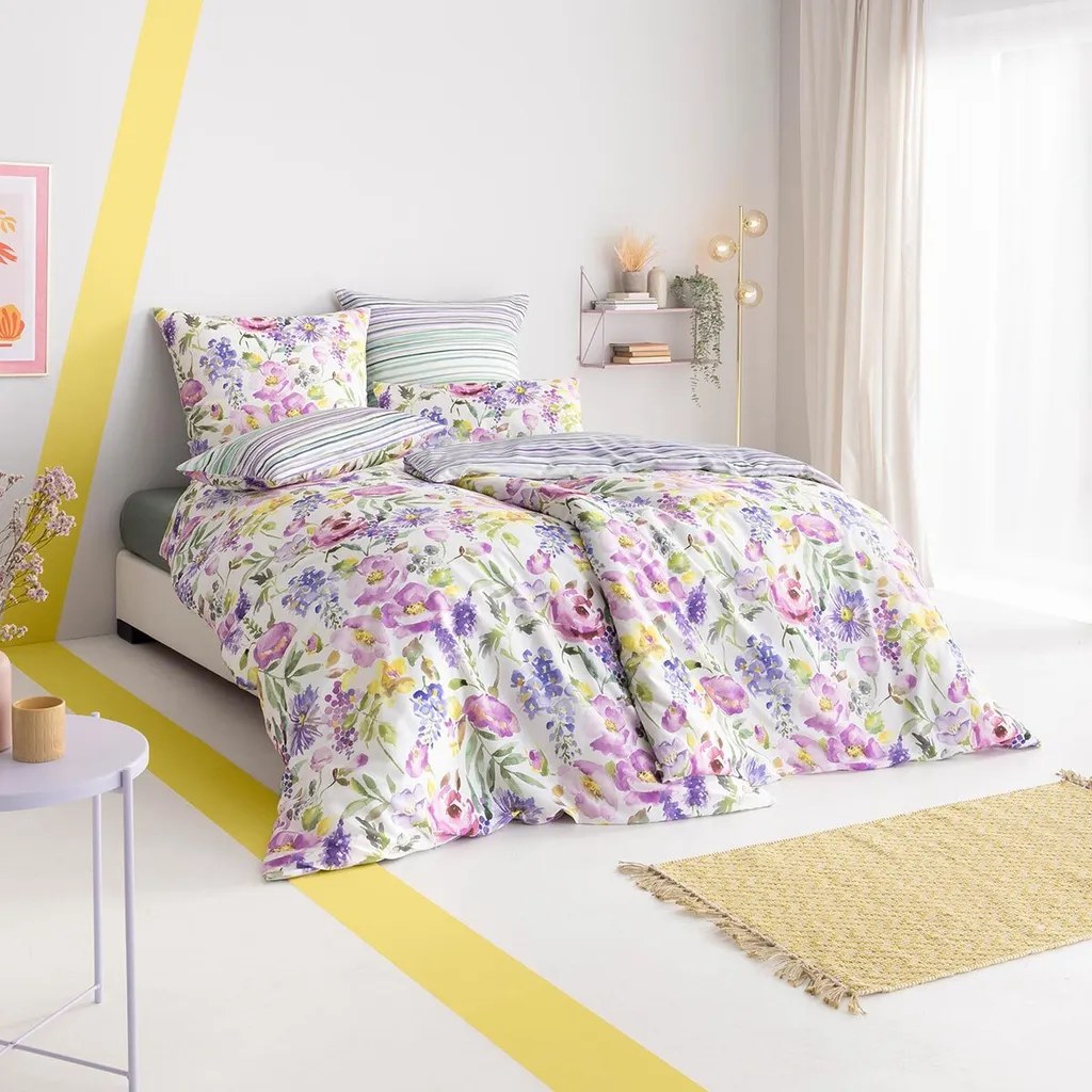 Постельное белье Wendy от Estella станет настоящим украшением вашей спальни. Живописный цветочный мотив в акварельном стиле простирается по всей передней части постельного гарнитура. Полосатая сторона обложки выдержана в том же цветовом стиле и идеально дополняет цветочный дизайн. Устройтесь поудобнее в дышащем и мягком пододеяльнике из 100-процентного хлопка гладкого атласа Mako и наслаждайтесь абсолютным комфортом во время сна.