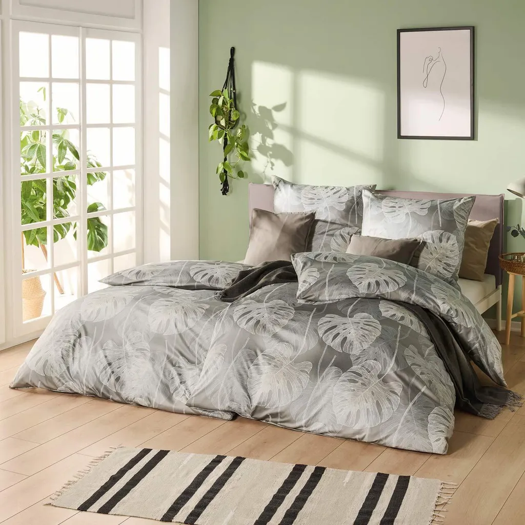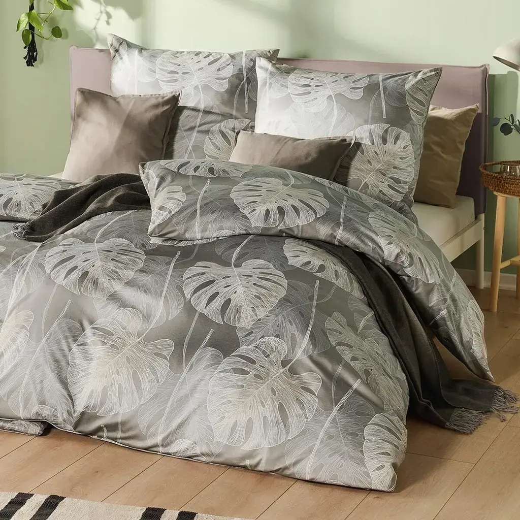 Постельное белье из интерлока Estella Atelier Mako DELICIA - Хотите, чтобы в вашем доме появилось немного тропического ощущения? Тогда наволочки и пододеяльники из комплекта «Делисия» должны прийтись именно вам по вкусу. Постельное белье впечатляет крупным принтом впечатляющих листьев филодендрона. В то же время декоративный комплект постельного белья идеально впишется в вашу комнату – благодаря адаптируемому базовому цвету «бежевый». Постельное белье, изготовленное из негладкого трикотажа интерлок Mako из чистого хлопка, обеспечивает особые ощущения от сна во всех отношениях. Мягкая, плотная вязка и приятная для кожи ткань регулирует температуру и обеспечивает абсолютный комфорт круглый год. За этим постельным бельем очень легко ухаживать, его можно сушить в стиральной машине, его не нужно гладить, оно сохраняет форму даже после многочисленных стирок. Постельное белье из интерлока Mako от Estella – идеальное четырехсезонное постельное белье! Для постельного белья из интерлок-джерси Delicia Mako мы рекомендуем притачное полотно цвета 202-пудровый или 080-нефрит.