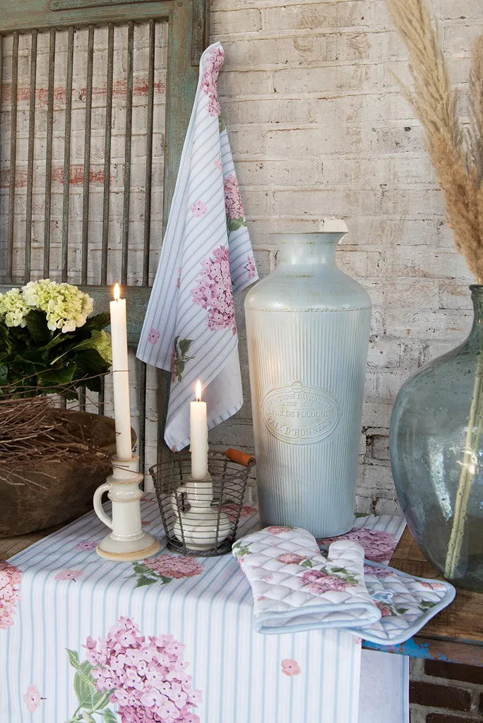 Когда вы думаете о лете, вы думаете о цветущих гортензиях. Эта текстильная серия посвящена этому летнему цветку. Голубой фон создает свежую основу, а полосатый узор придает этой серии классический оттенок. Узор гортензии с акцентами розового цвета привлекает внимание и привлекает внимание. Этот обширный текстиль, помимо версии для взрослых, также доступен с кухонным фартуком, прихватками и прихватками для детей.