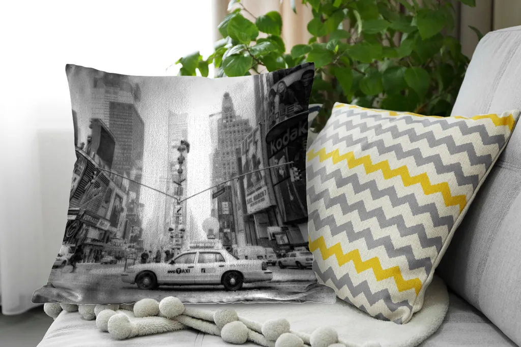 Такси едет по улице Нью-Йорка. На заднем плане можно увидеть несколько рекламных щитов на зданиях.Доставка товаров осуществляется курьером или на пункт выдачи заказов.
