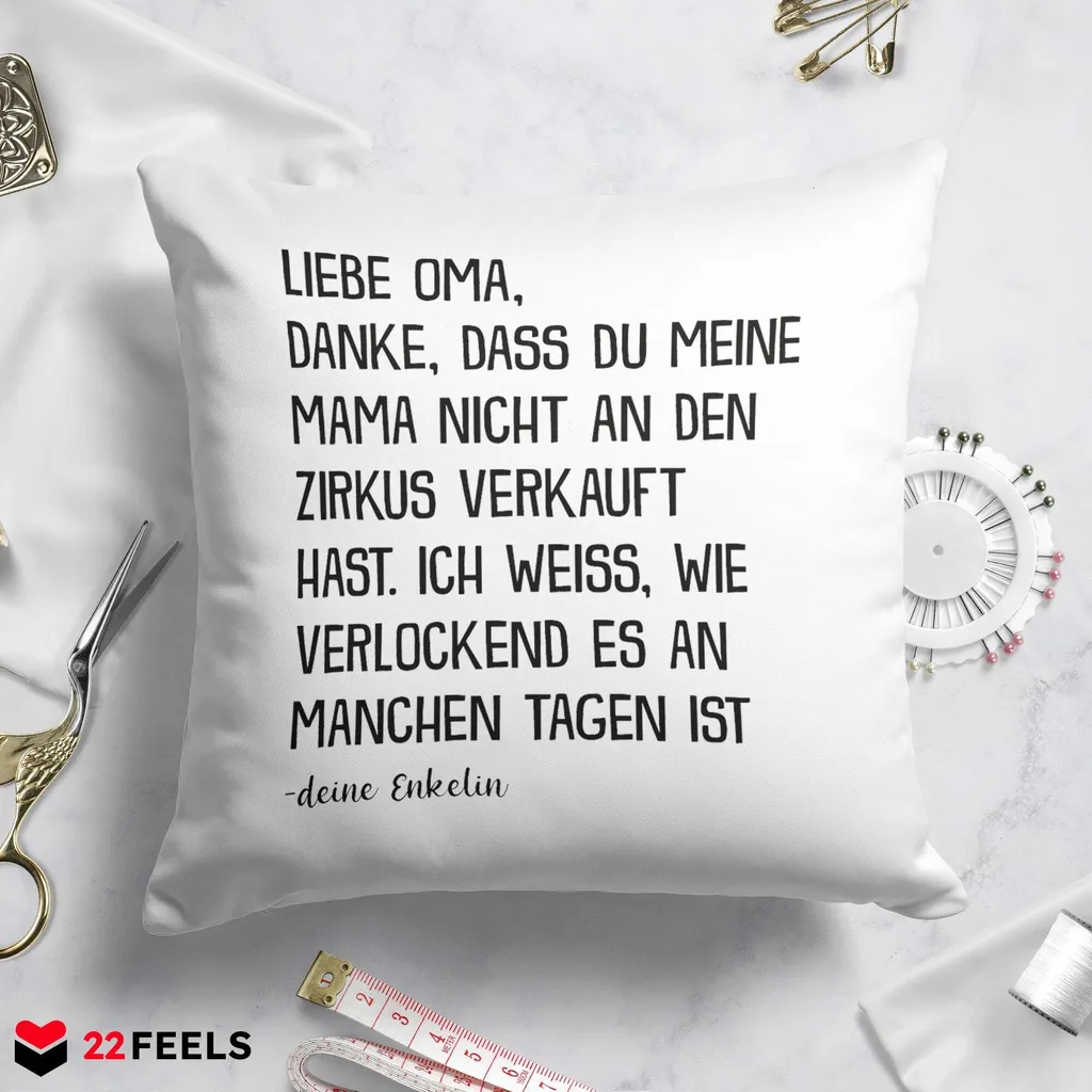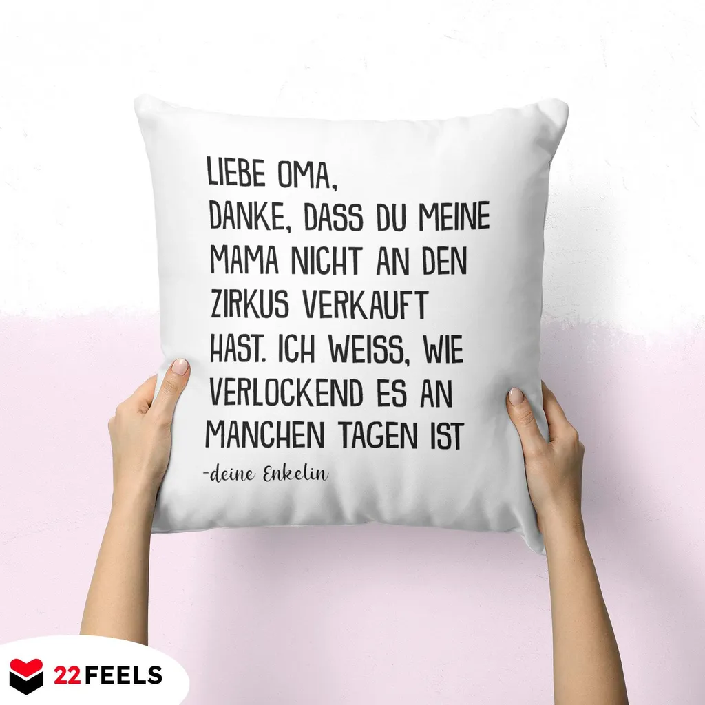 На чехле на подушке написано: Дорогая бабушка, спасибо, что не продала мою маму в цирк. Я знаю, как это иногда бывает заманчиво - твоя внучка