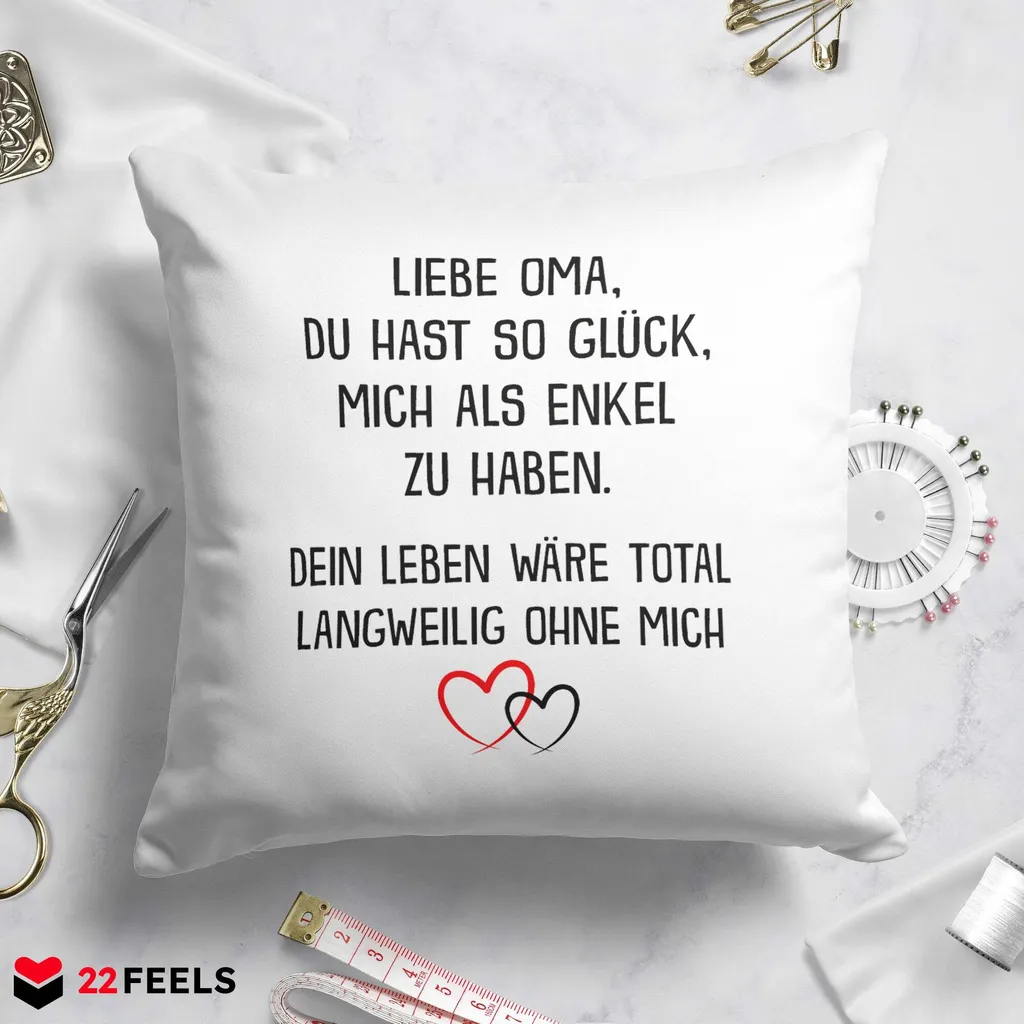 На чехле на подушке написано: Дорогая бабушка, тебе так повезло, что у меня есть внук. Без меня ваша жизнь была бы совсем скучной.