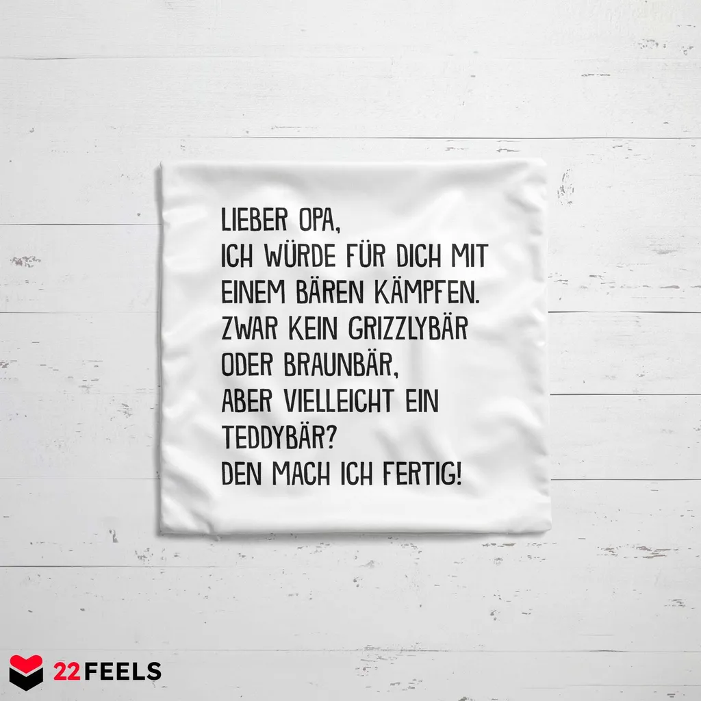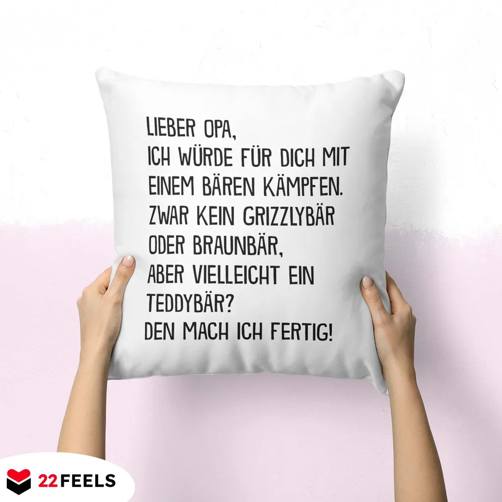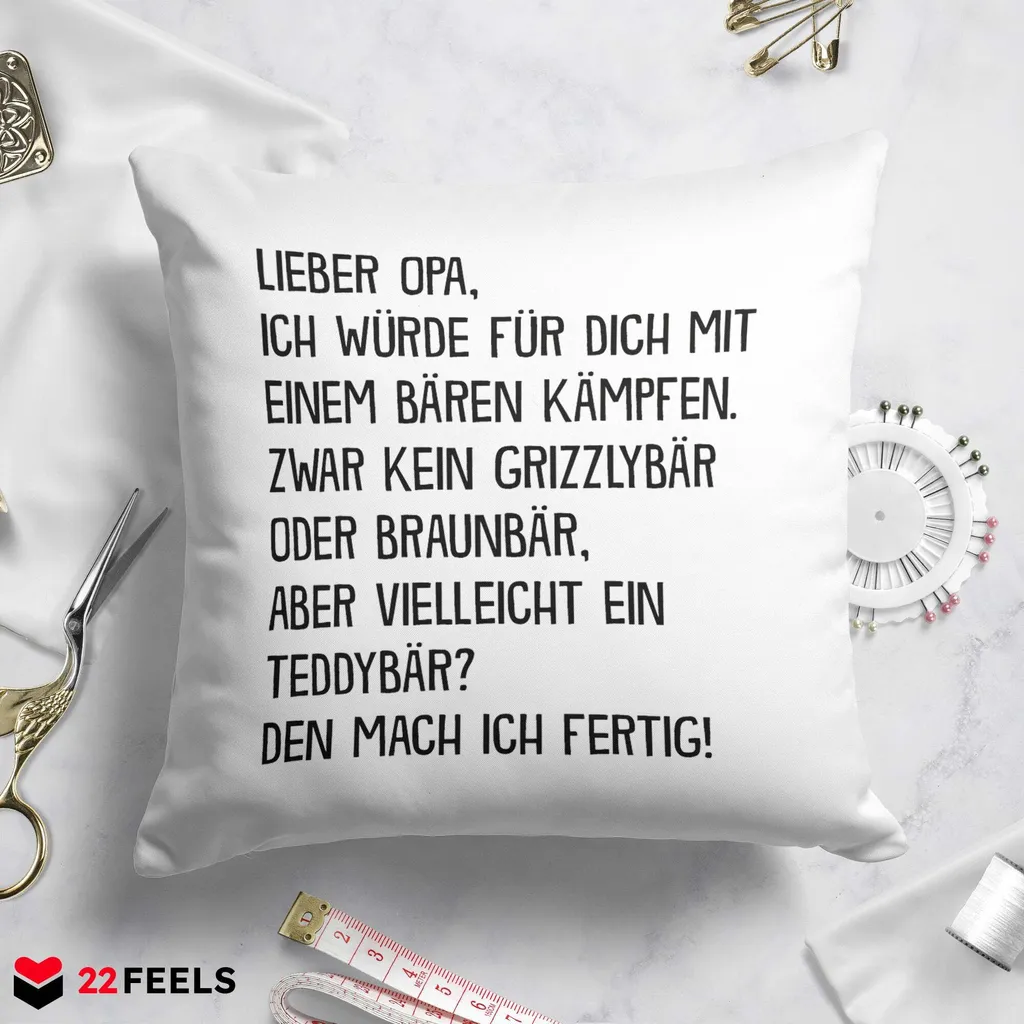 На чехле на подушке написано: Дорогой дедушка, ради тебя я бы подралась с медведем. Не гризли и не бурый медведь, а, может быть, плюшевый мишка? Я доделаю!